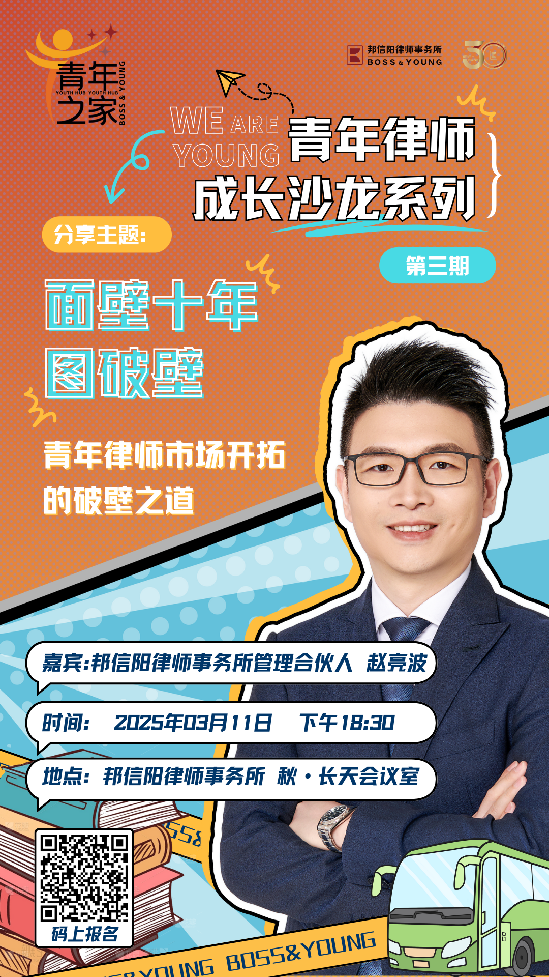 第三期青年律师成长沙龙邀请到上海邦信阳律师事务所管理合伙人赵亮波律师为青年律师分享《面壁十年图破壁:青年律师市场开拓的破壁之道》,欢迎扫描海报二维码报名线下参与。