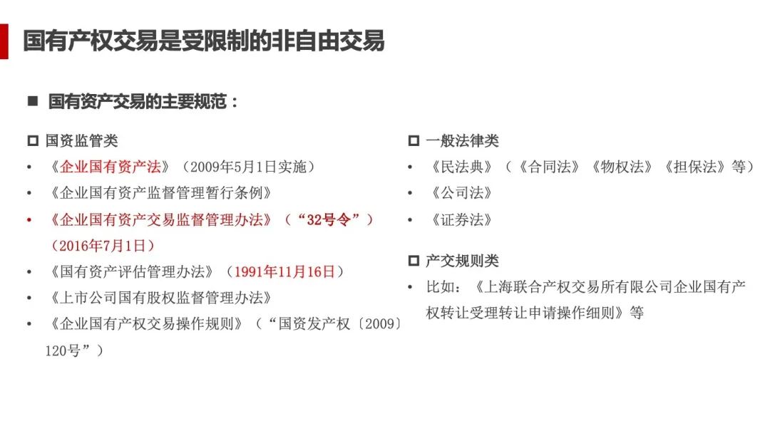 第二部分“国有产权交易是受限制的非自由交易”,林茂老师向同学们讲述了国有产权交易中需要注意的相关法律规范,主要包括《企业国有资产交易监督管理办法》、《公司法》以及《上海联合产权交易所有限公司企业国有产权转让受理转让申请操作细则》等。