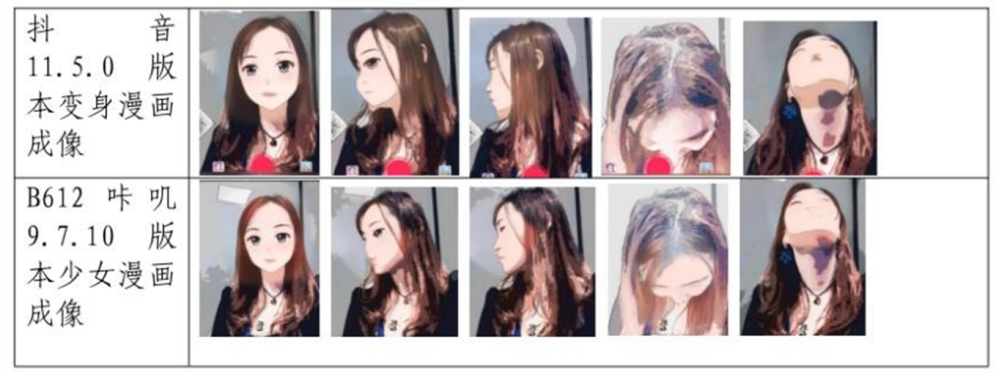 原告起诉理由 | 抖音公司主张:其于2020年6月在抖音App上线“变身漫画特效”,该特效能够将用户实时拍摄的照片、视频转换为漫画风格。至2021年,该特效已吸引近2000万用户使用,相关视频播放量近3亿次。同年8月4日,亿睿科公司在其运营的“B612咔叽App”中上线了功能高度相似的“少女漫画特效”。通过技术比对发现,两款特效生成的漫画图像在线条、脸形、色彩、五官比例等方面基本一致,如下图:
