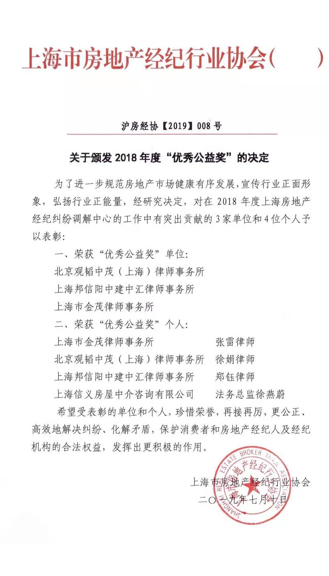2019年7月10日,上海房地产经纪行业协会发布了《关于颁发2018年度“优秀公益奖”的决定》。其中,上海邦信阳中建中汇律师事务所荣获“优秀公益奖”单位奖,上海邦信阳中建中汇律师事务所郑钰律师荣获“优秀公益奖”个人奖。