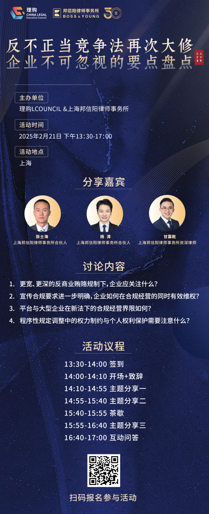 基于上述背景,邦信阳律师事务所合伙人张士海,合伙人杨涛, 资深律师甘震乾围绕反法大修内容,帮助企业深入理解反法大修要点,明晰调整方向。