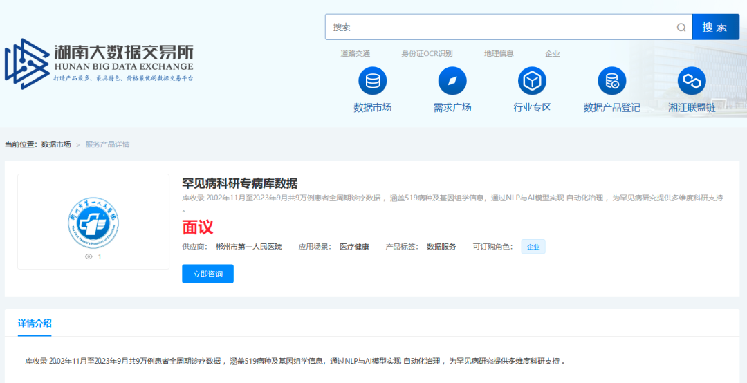 湖南省郴州市第一人民医院自主研发的“罕见病科研专病库数据”及“老年共病疾病诊断及住院负担数据集”两项数据产品,已完成合规性及合法性审查程序,并正式在湖南省大数据交易所挂牌上架,成为湖南省医疗机构中首个达成“双登记(数据资源登记、数据产品登记)”的机构。其中,罕见病科研专病库数据集聚焦罕见病诊断难、研究少、数据分散等痛点,通过医疗多模态数据整合,为临床研究、新药试验、AI辅助诊断提供重要支撑。