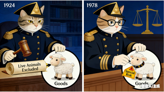 60余年后,《海牙规则》第 1 条(c)款,将“live animals”排除在“goods”的定义之外。