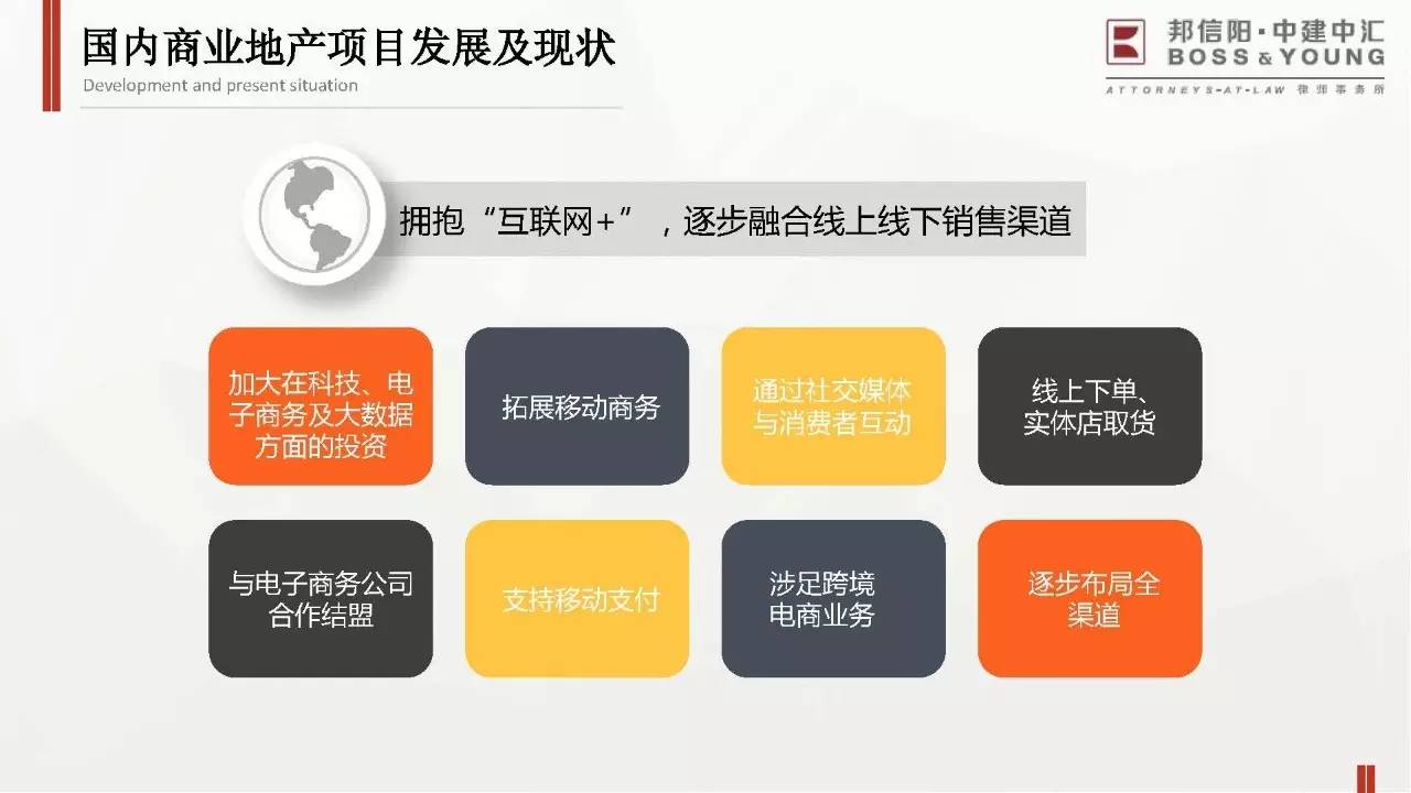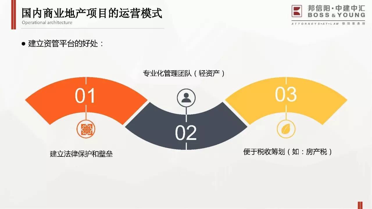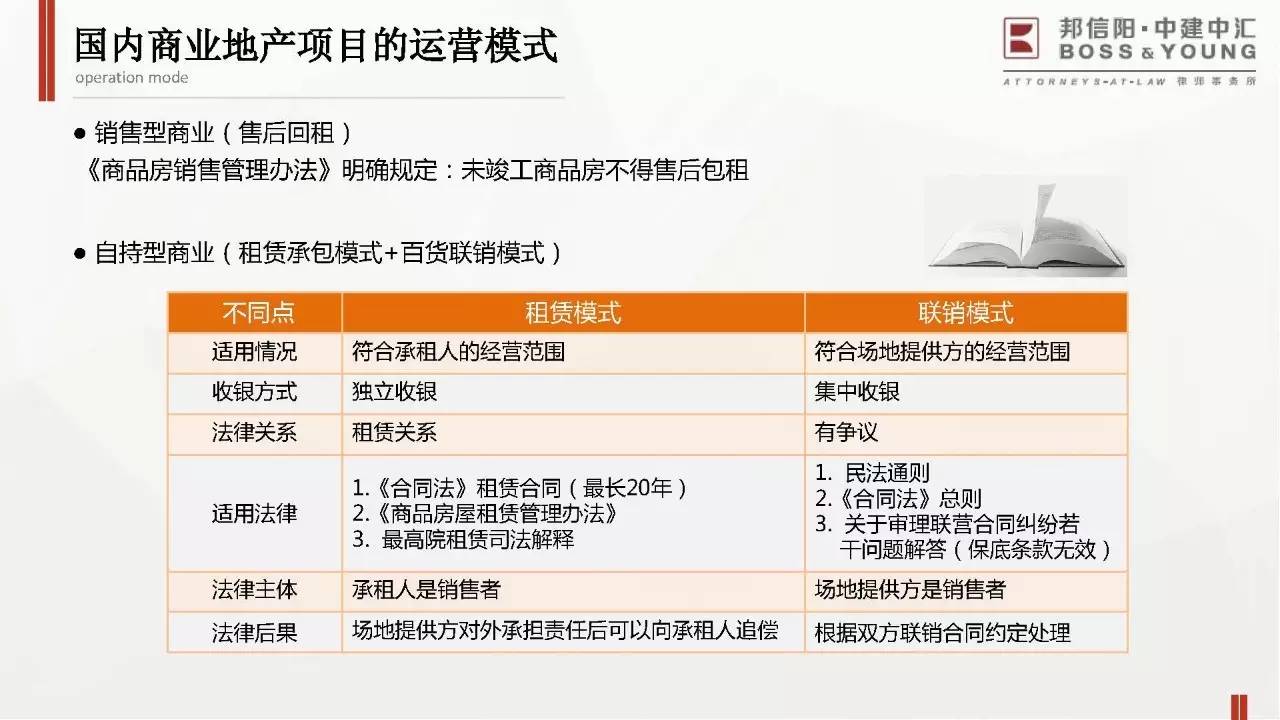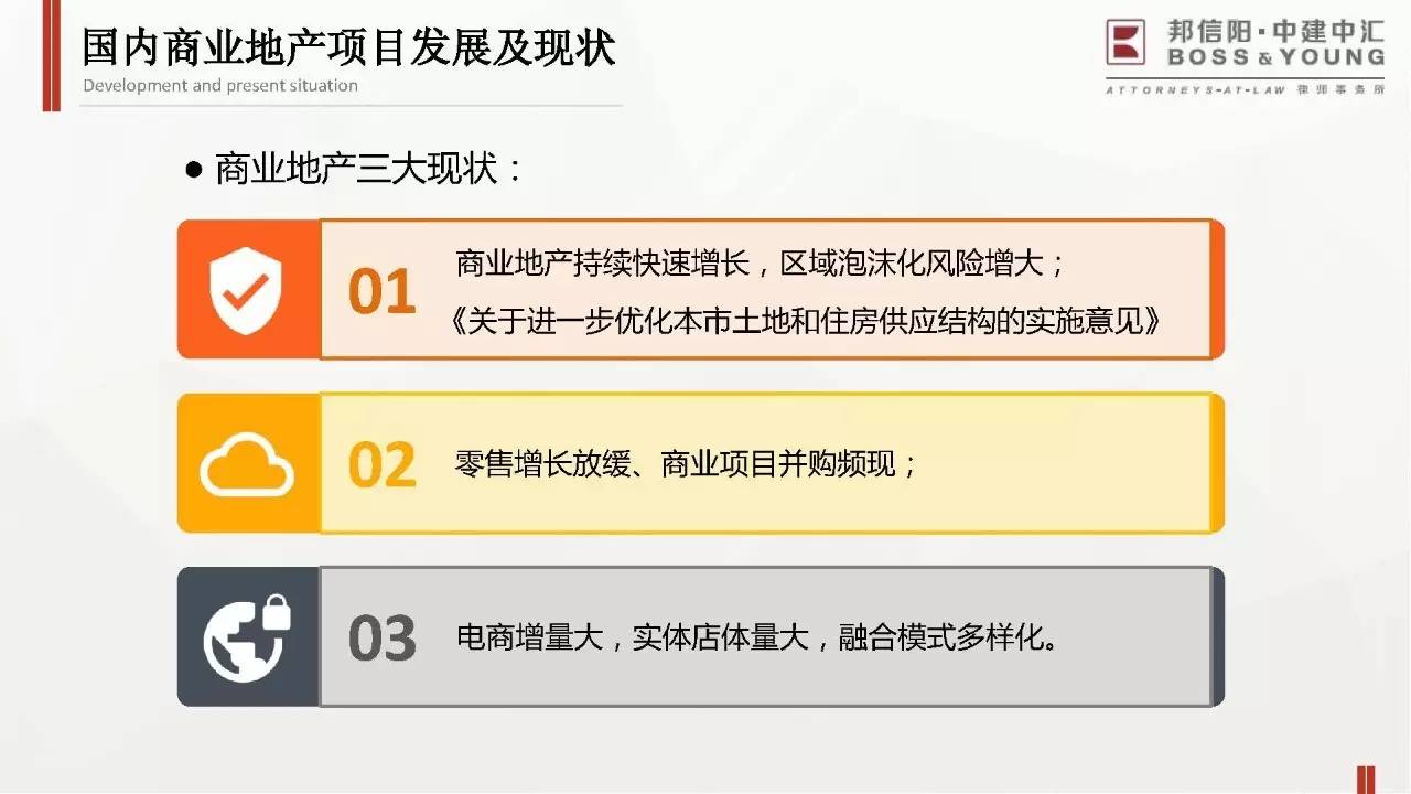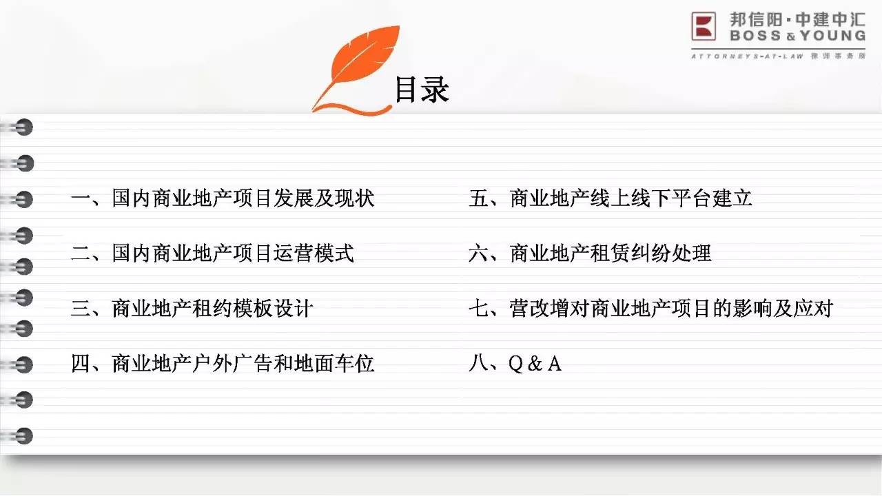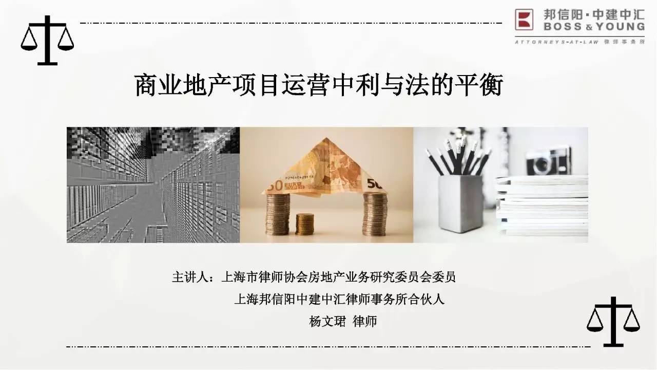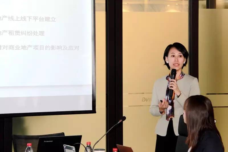 此次讲座由上海邦信阳中建中汇律师事务所合伙人杨文珺律师主讲。杨律师从商业地产项目的发展及现状、运营模式、专业运营构架、租约设计、户外广告和地面车位、线上线下平台建设、租赁及物业纠纷处理、营改增对商业地产项目的影响及应对等方面进行了分享。