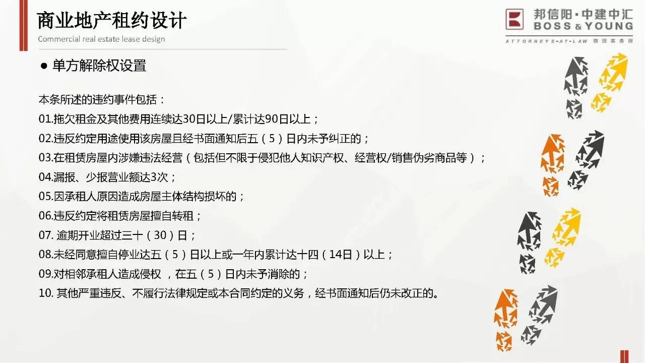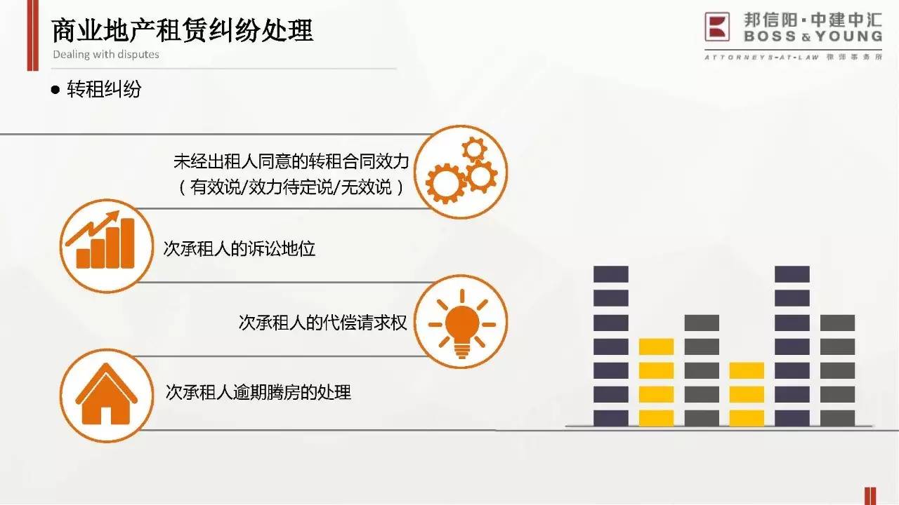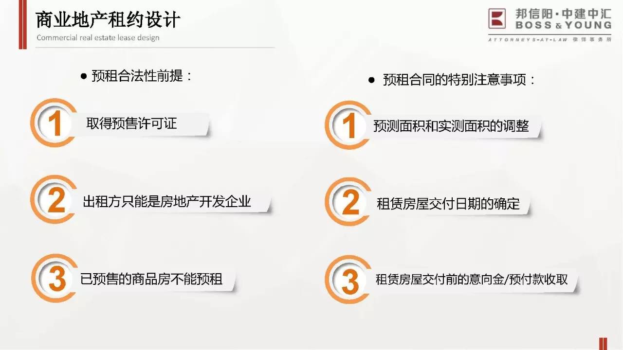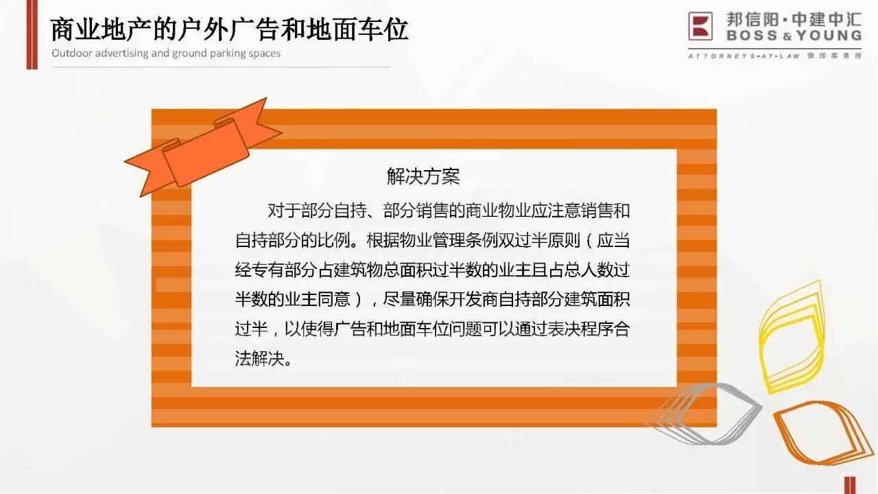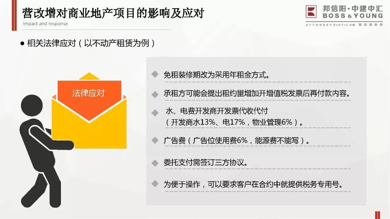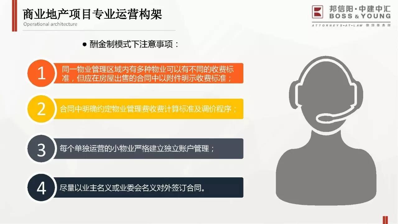 此次讲座由上海邦信阳中建中汇律师事务所合伙人杨文珺律师主讲。杨律师从商业地产项目的发展及现状、运营模式、专业运营构架、租约设计、户外广告和地面车位、线上线下平台建设、租赁及物业纠纷处理、营改增对商业地产项目的影响及应对等方面进行了分享。