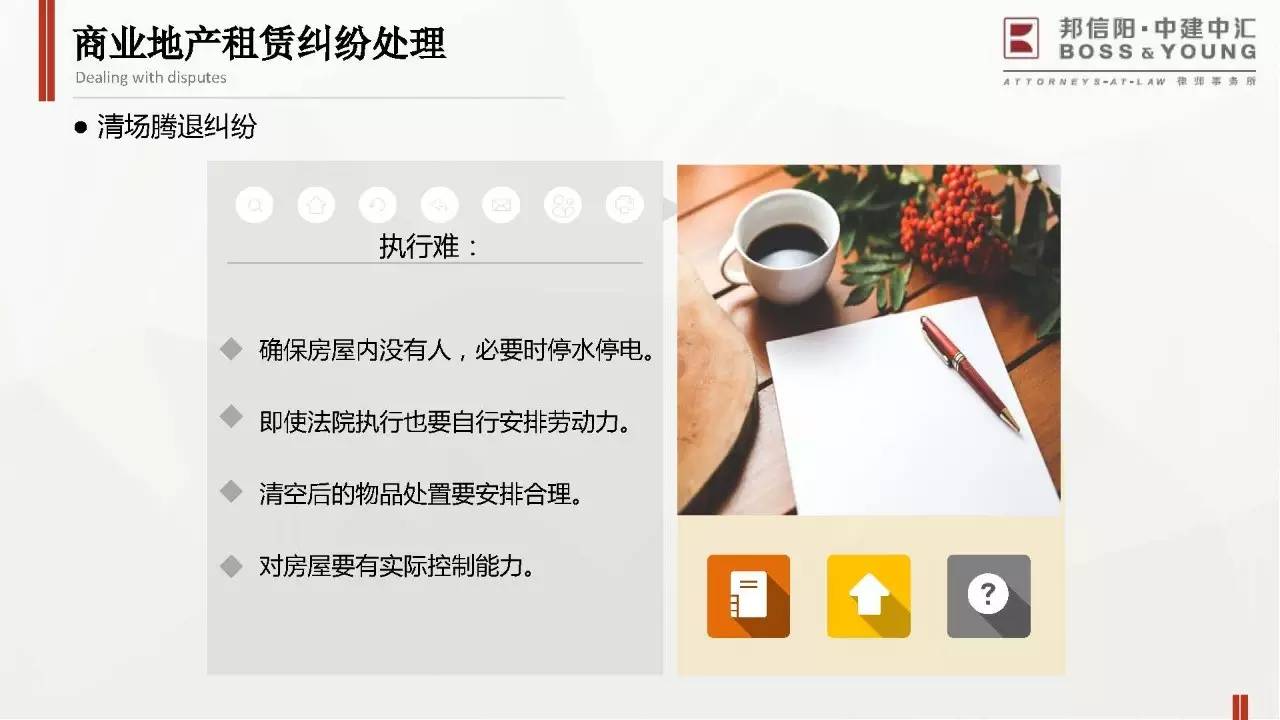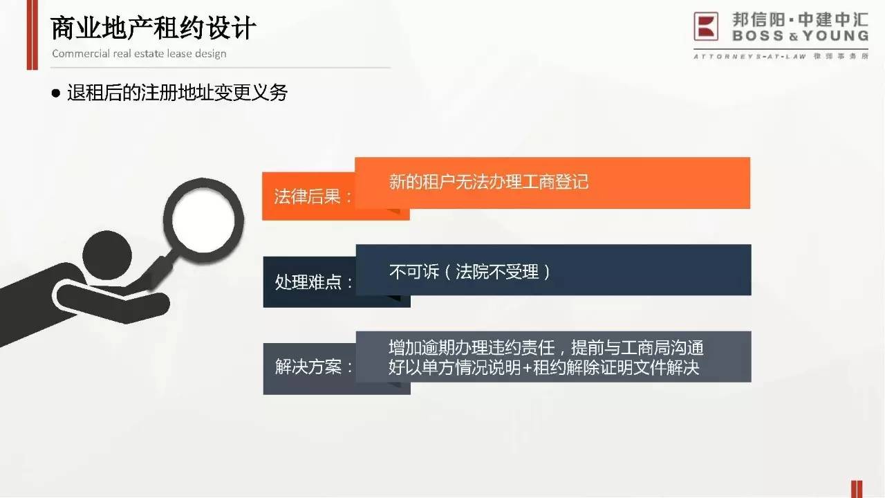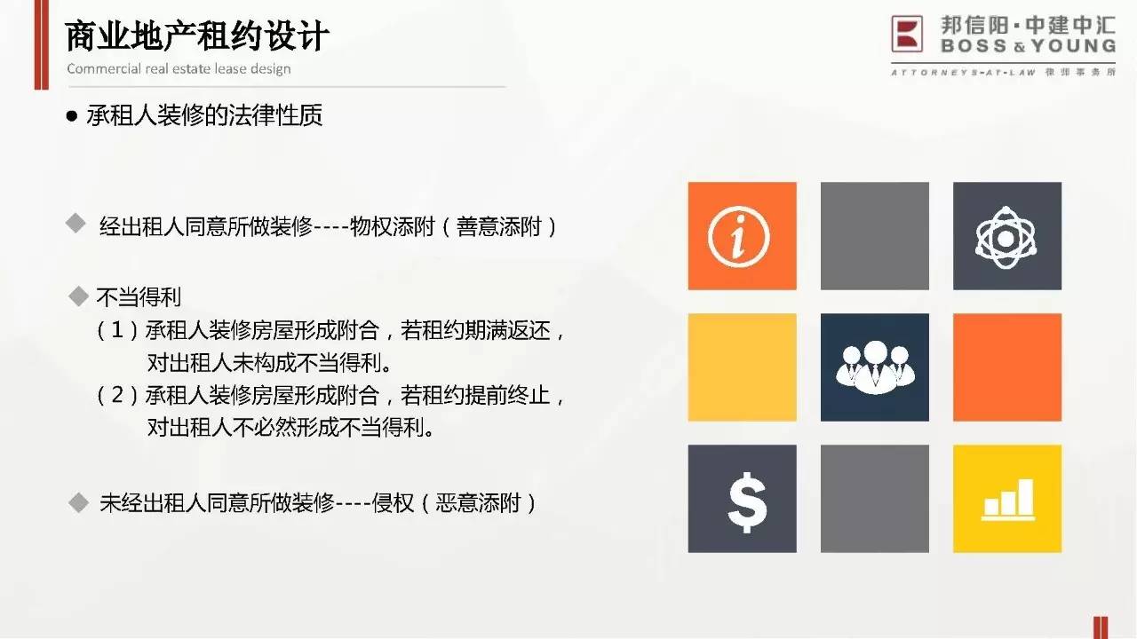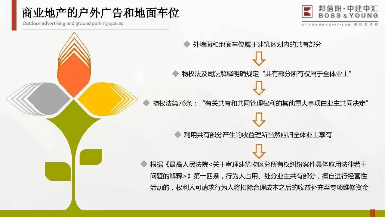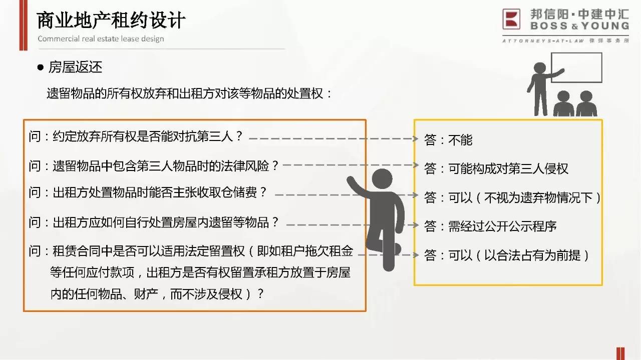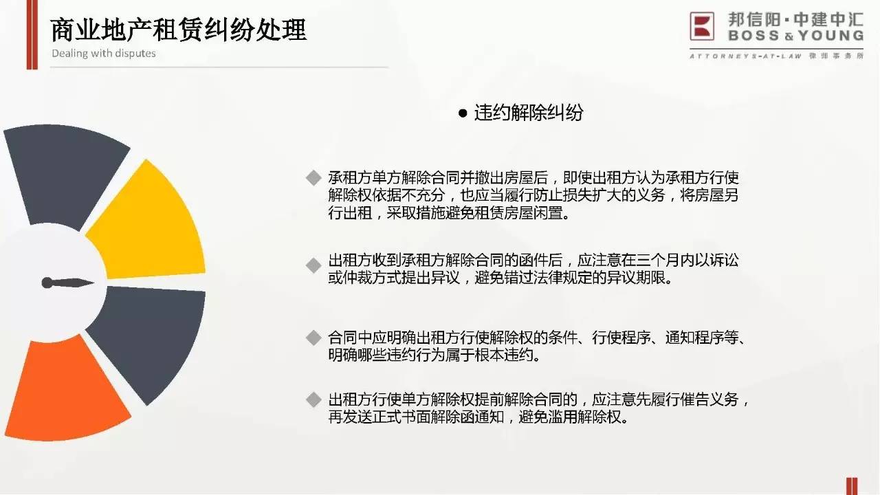 此次讲座由上海邦信阳中建中汇律师事务所合伙人杨文珺律师主讲。杨律师从商业地产项目的发展及现状、运营模式、专业运营构架、租约设计、户外广告和地面车位、线上线下平台建设、租赁及物业纠纷处理、营改增对商业地产项目的影响及应对等方面进行了分享。