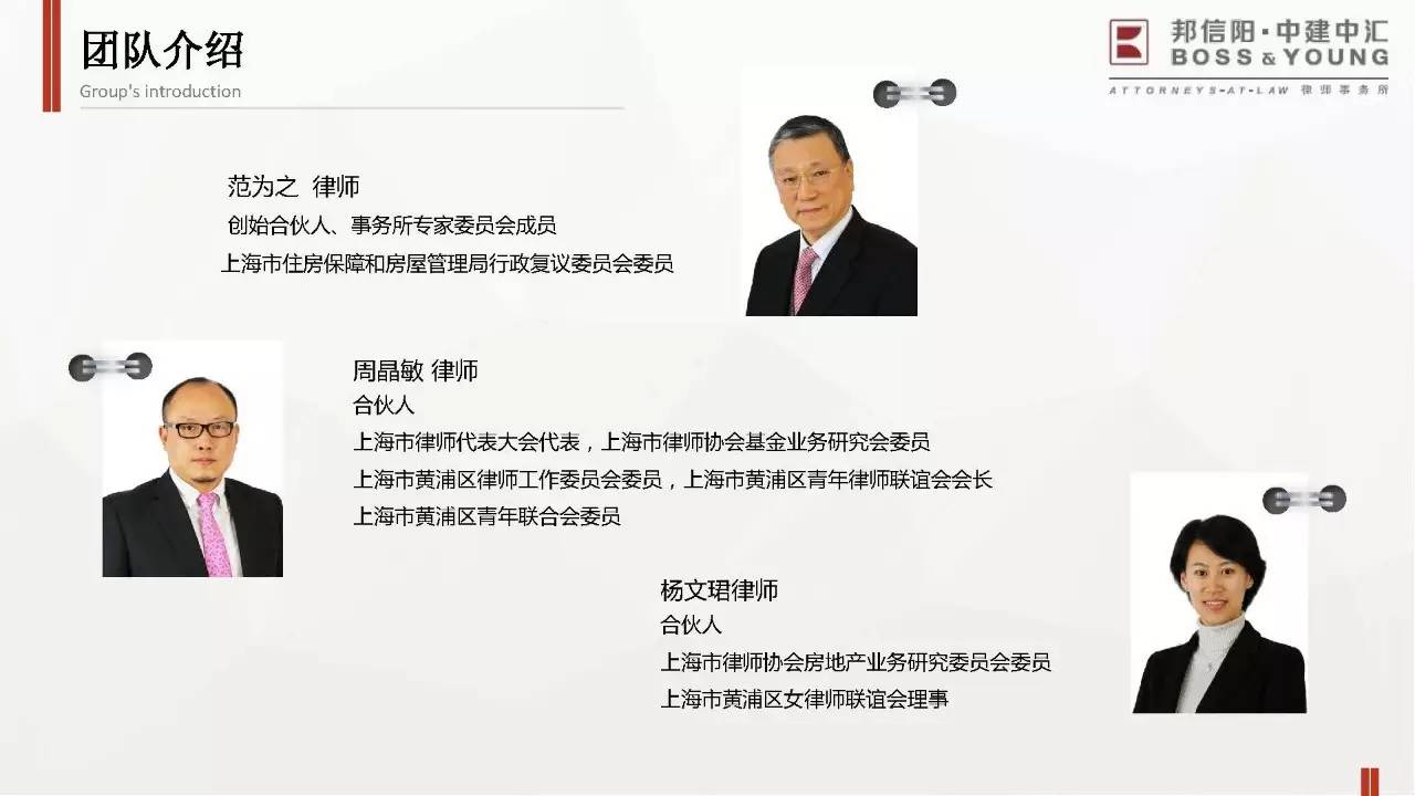 杨文珺律师现为上海邦信阳中建中汇律师事务所合伙人;上海市律师协会房地产业务研究委员会委员;上海市黄浦区女律师联谊会理事。杨律师擅长房地产项目开发建设及转让、商品房销售、商业地产租售、外资企业设立、银团贷款等法律服务领域的非讼和诉讼业务,常年为地产集团、南桥新城、中房 集团、古北集团、崇邦集团、香港新世界、仲量联行、绿都房产等多家知名企业提供诉讼和非诉讼法律服务。杨律师曾为多个城市综合体项目提供从土地取得、项目 建设与融资、预/出租售、商用物业运营管理、020平台设立等全过程法律服务,其中知名商业地产项目主要包括K11、大宁国际、金桥国际、嘉亭荟、古北高 岛屋、大拇指广场、金谊广场、康健广场、昆城国贸等。