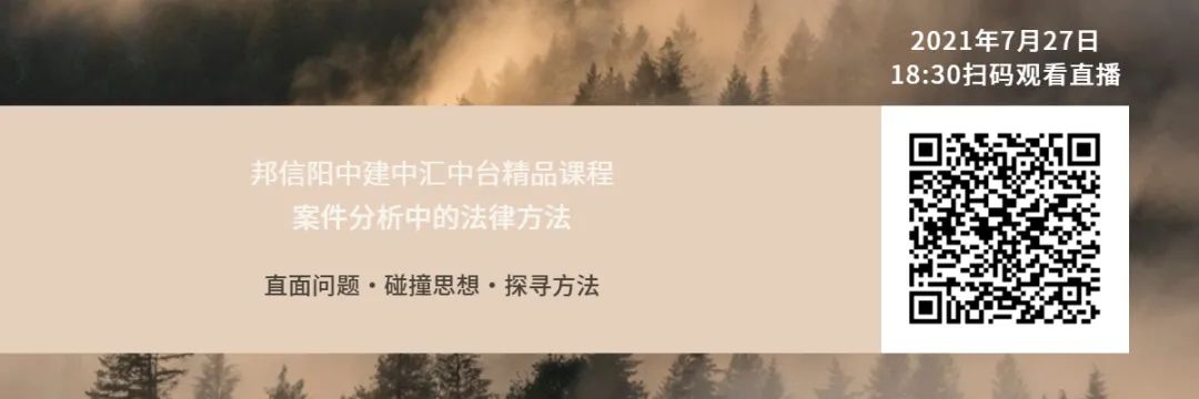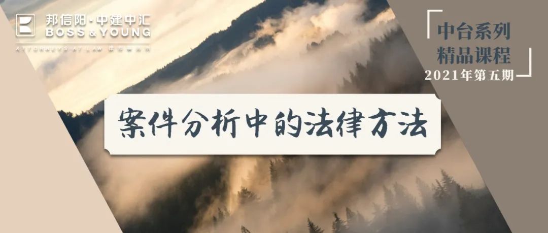 2021年7月27日(周二)18:30,邦信阳中建中汇中台精品课程第五期邀请华东政法大学杨代雄教授,主讲“案件分析中的法律方法”,并与邦信阳中建中汇合伙人杜爱武律师、韦剑律师、王源盛律师展开深入探究。