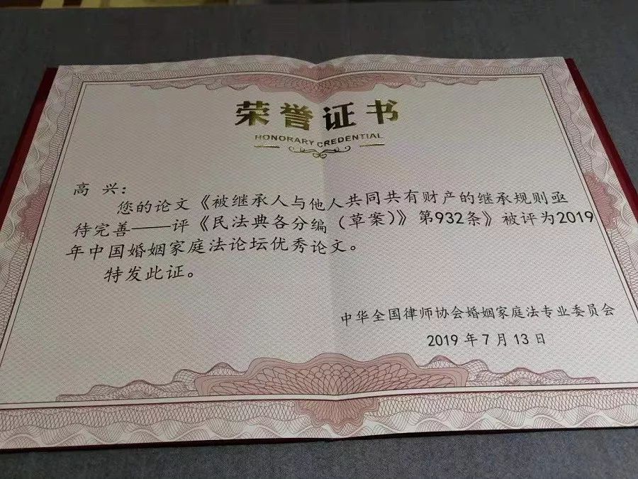 邦信阳中建中汇合伙人高兴律师参会并在大会上做专题发言。他提交的《被继承人与他人共同共有财产的继承规则亟待完善——评<民法典各分编(草案)>第932条》被评为本次论坛的优秀论文。