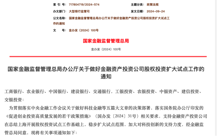 当前,我国社会融资总额中,间接融资仍然占据主体地位,这意味着需要走出一条具有中国特色的科技金融尤其是科创投资的发展之路。2020年以来,大型商业银行下设的金融资产投资公司通过先期在上海开展股权投资试点,探索了路径,积累了经验,锻炼了队伍,已具备扩大试点的条件。根据2024年6月国务院办公厅《促进创业投资高质量发展的若干政策措施》(国办发〔2024〕31号)有关部署,为切实发挥试点的引领带动作用,鼓励发展创业投资,培育壮大耐心资本,金融监管总局在充分吸纳相关部委、金融机构、地方政府意见的基础上,近日印发了《试点工作通知》和《试点范围通知》。