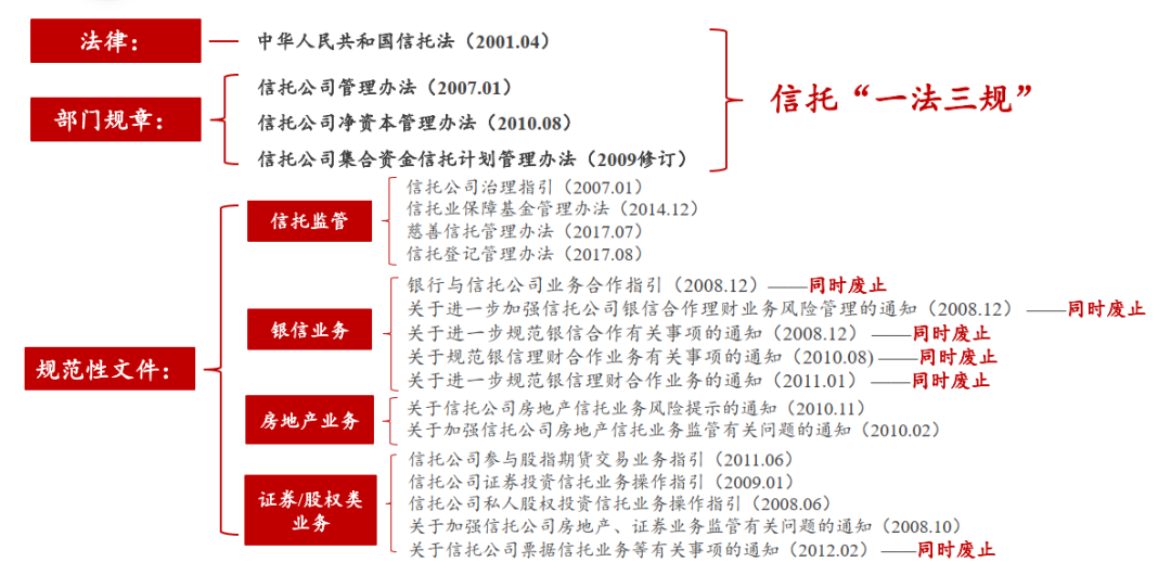 此前,信托领域的监管规则由“一法三规+特定业务的规范性文件”组成,主要监管文件如下:
