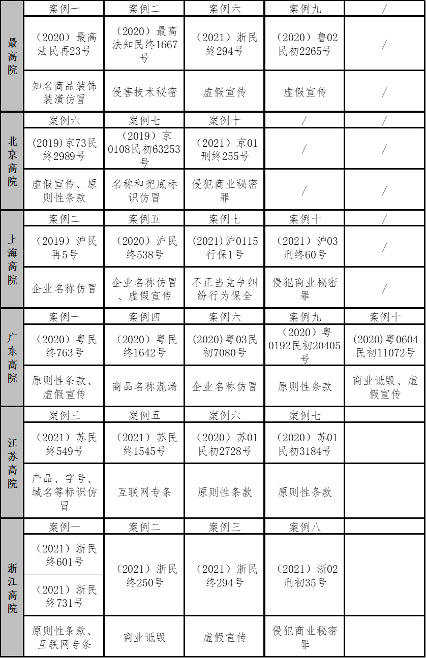 就最高院和北上广江浙高院反不正当竞争十大案例作进一步类型化梳理: