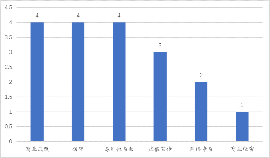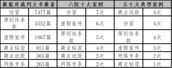 笔者又在某数据库上检索了所收录的近年反不正当竞争案件文书数量(包含判决和裁定),在不考虑是否完整收录实际发生案例的情况下,案件数量从多到少依次为仿冒7477篇、原则性条款3552篇、虚假宣传1867篇、商业秘密951篇、商业诋毁365篇、网络专条263篇。