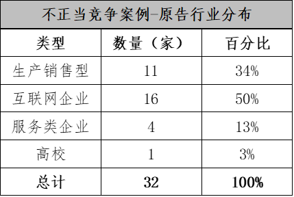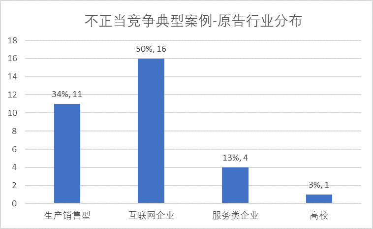 3、互联网企业成为运用不正当竞争维权最积极的主体,扣除重复计算案例后,最高院颁布的10大和50典型中共计32个案子,其中以原告身份出现的前两名企业反别为腾讯(6次)、央视国际(2次)、饿了么(即拉扎斯,2次)、美团(含三快及汉涛等公司,2次),其余企业均为一次。上述排名靠前企业均为互联网企业或将互联网作为重要经营阵地的企业, 而从下列图表的统计则更为直观: