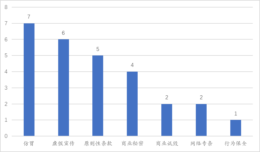 仅从原告主张内容来看,目前24件反不正当竞争案件中,有些主张单一条款,而有一些同时援引多条进行维权,其中仿冒条款主张7次,排名第一,虚假宣传(最高院和浙江高院重复统计的案件仅计算一次)和原则性条款均主张6次并列第二,其后依次为商业秘密4次、商业诋毁和网络专条各2次、行为保全1次。
