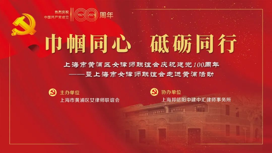 中国共产党带领全国人民披荆斩棘,砥砺奋进,已然走过了一百年时间。百年峥嵘岁月,百年奋斗如歌,为了庆祝中国共产党成立100周年,进一步落实党史学习教育,坚守初心信念,2021年5月27日下午,“巾帼同心、砥砺同行”上海市黄浦区女律师联谊会庆祝建党100周年一一暨上海市女律师联谊会走进黄浦活动,在上海邦信阳中建中汇律师事务所总部黄浦区金外滩国际广场15楼成功举办。本次活动由上海市黄浦区司法局、上海市黄浦区律师行业党委、上海市黄浦区律师工作委员会、上海市女律师联谊会指导,上海市黄浦区女律师联谊会主办,上海邦信阳中建中汇律师事务所协办。