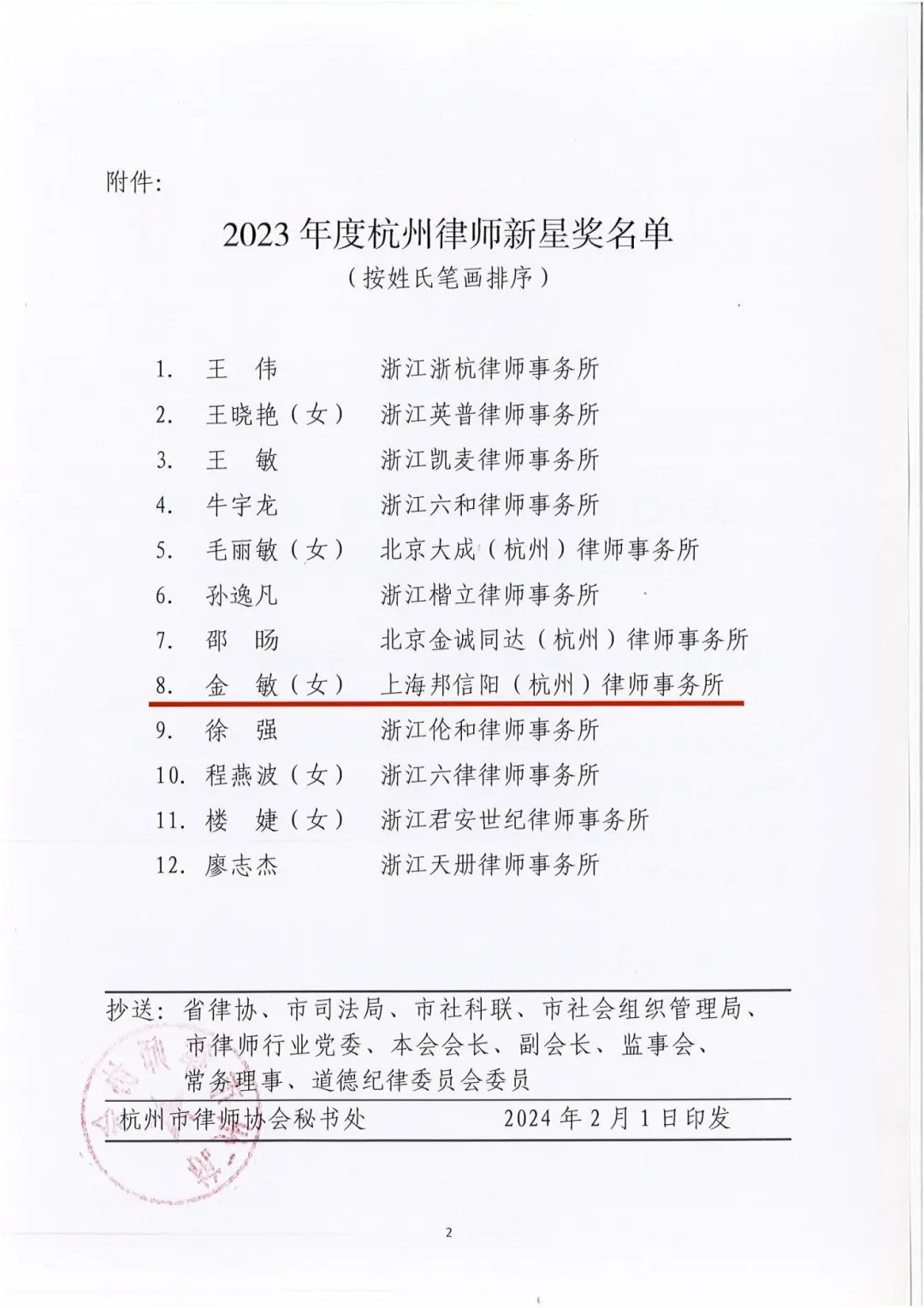 上海邦信阳(杭州)律师事务所金敏律师荣获“2023年度杭州律师新星奖”荣誉称号,于微律师、李辉辉律师荣获律师“个人通报表扬”荣誉、赵玲荣获行政辅助人员“个人通报表扬”荣誉。