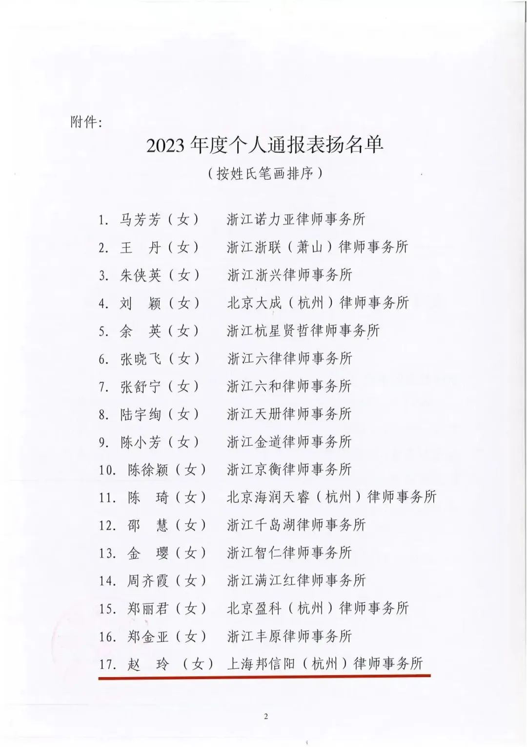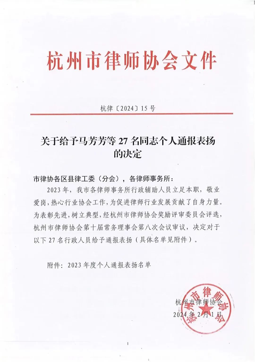 2023年,杭州市各律师事务所行政辅助人员立足本职,敬业爱岗,热心行业协会工作,为促进律师行业发展贡献了自身力量。为表彰先进,树立典型,经杭州市律师协会奖励评审委员会评选,杭州市律师协会第十届常务理事会第八次会议审议,决定对于以下27名行政人员给予通报表扬。上海邦信阳(杭州)律师事务所所赵玲获得“个人通报表扬”荣誉。
