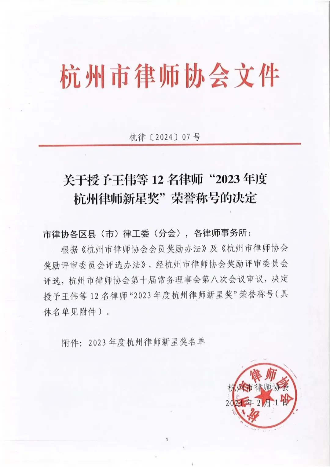 为鼓励先进,进一步调动律师行业积极性,推动法治杭州建设高效健康发展,根据《杭州市律师协会会员奖励办法》及《杭州市律师协会奖励评审委员会评选办法》,经杭州市律师协会奖励评审委员会评选,杭州市律师协会第十届常务理事会第八次会议审议,杭州市律师协会发布 《关于授予王伟等12名律师“2023年度杭州律师新星奖”荣誉称号的决定》、《关于给予于微等38名律师个人通报表扬的决定》、《关于给予马芳芳等27名同志个人通报表扬》等文件。