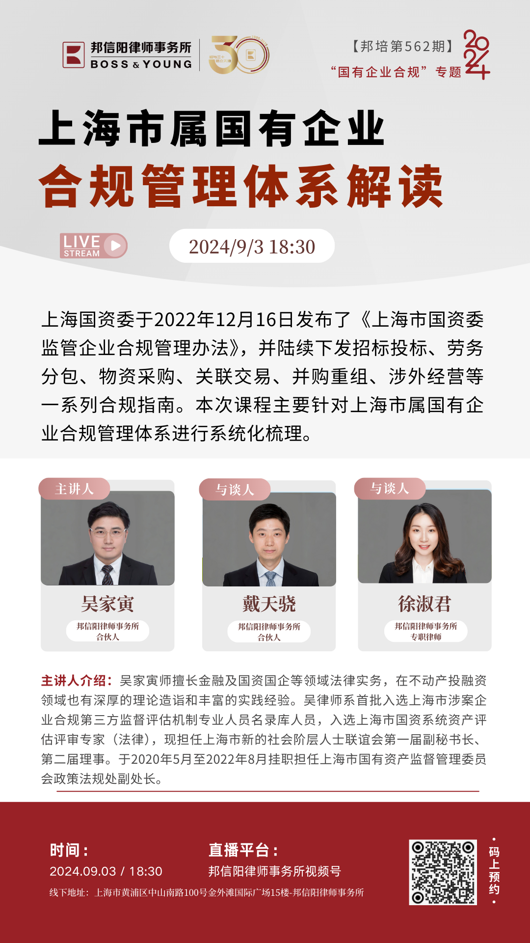 【邦培第562期:上海市属国有企业合规管理体系解读】9月3日晚18:30在邦信阳律师事务视频号直播,欢迎扫码预约。