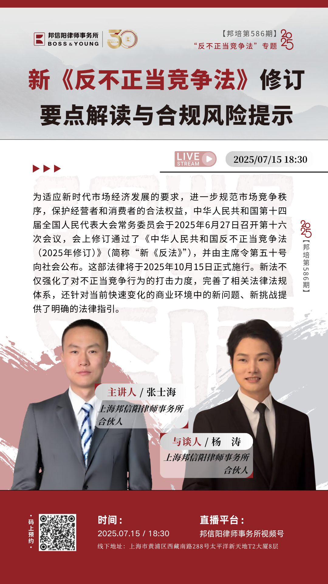 【邦培第586期:新《反不正当竞争法》热点分析与企业合规实务分享】7月15日晚18:30在邦信阳律师事务所视频号直播,欢迎扫码预约。