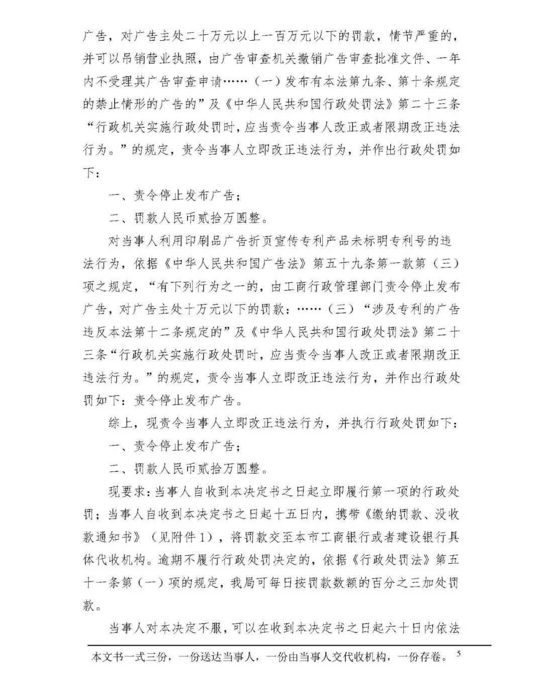3)涉及专利,未按照《广告法》第十二条的规定标明专利号——责令停止发布。