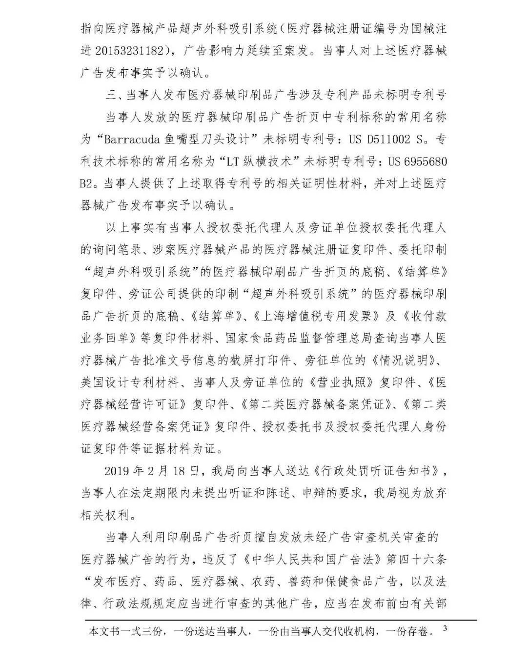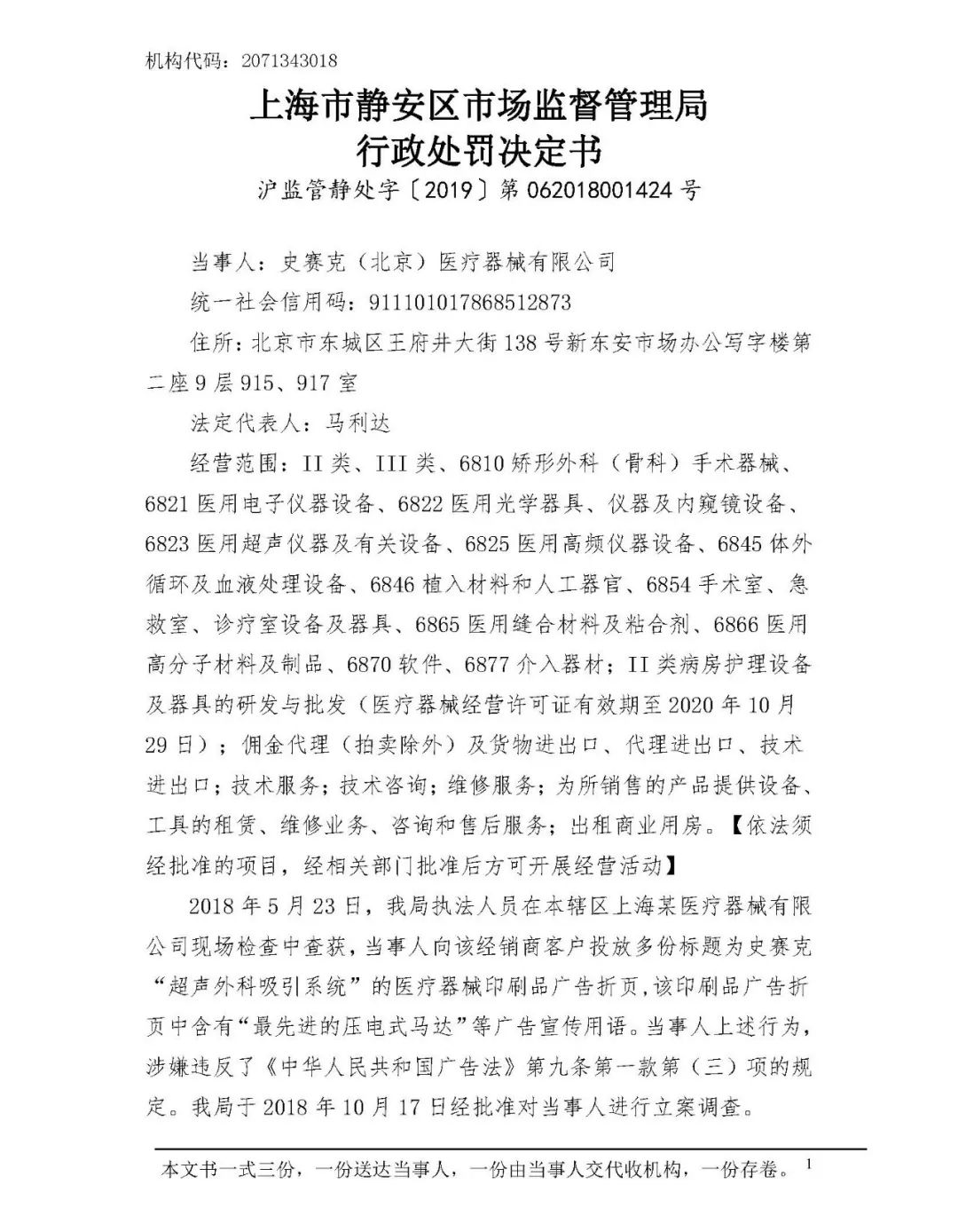 上海市静安区市场监督管理局(以下简称“处罚机关”)于2019年2月22日作出沪监管静处字〔2019〕第062018001424 号处罚决定,认定史赛克(北京)医疗器械有限公司(以下简称“当事人”)向经销商发放“超声外科吸引系统”产品资料属于商业广告行为并加以处罚。