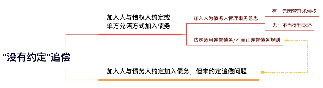 本条所述“没有约定”,其实可进一步细化为两层:一是加入人与债务人未就债务加入事宜进行约定,即加入人是以与债权人约定或单方允诺方式加入债务;二是加入人与债务人存在债务加入约定,但未明确追偿问题。