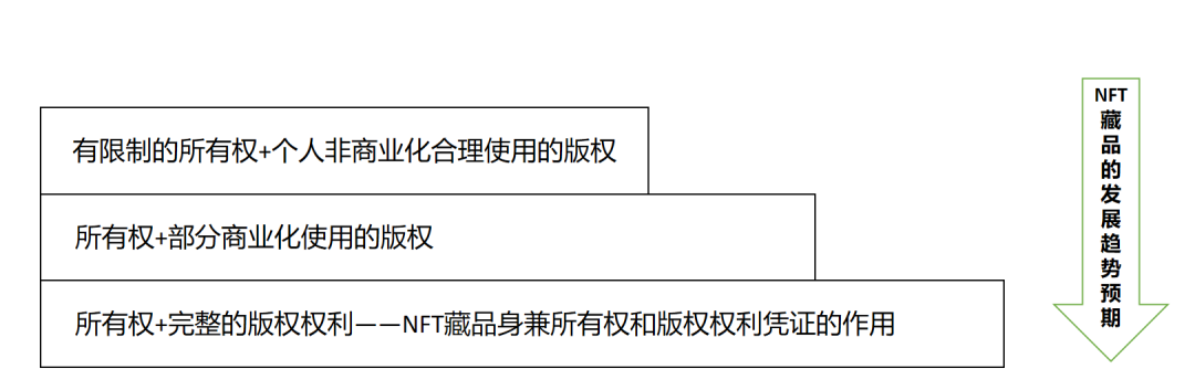 笔者认为,此种商业化的经营思路应当是未来NFT藏品的发展趋势,即将NFT藏品由目前“有限制的所有权+个人非商业化合理使用的版权”发展到“所有权+部分商业化使用的版权”、到最终“所有权+完整的版权”,使得NFT藏品最后能够成为对基础作品的版权凭证,而后能够通过NFT藏品的所有权移转实现其对上基础作品的知识产权的移转的有效追溯,进而有效解决因知识产权本身的无形性导致的权利移转不透明问题。但毕竟NFT藏品在目前看来还是一个比较新的概念,笔者建议在陆续开放购买者对NFT藏品拥有的权利范围时,还是应当分阶段逐步进行,并且在每一个阶段内尽量做到各平台开放权利类型和范围的统一。