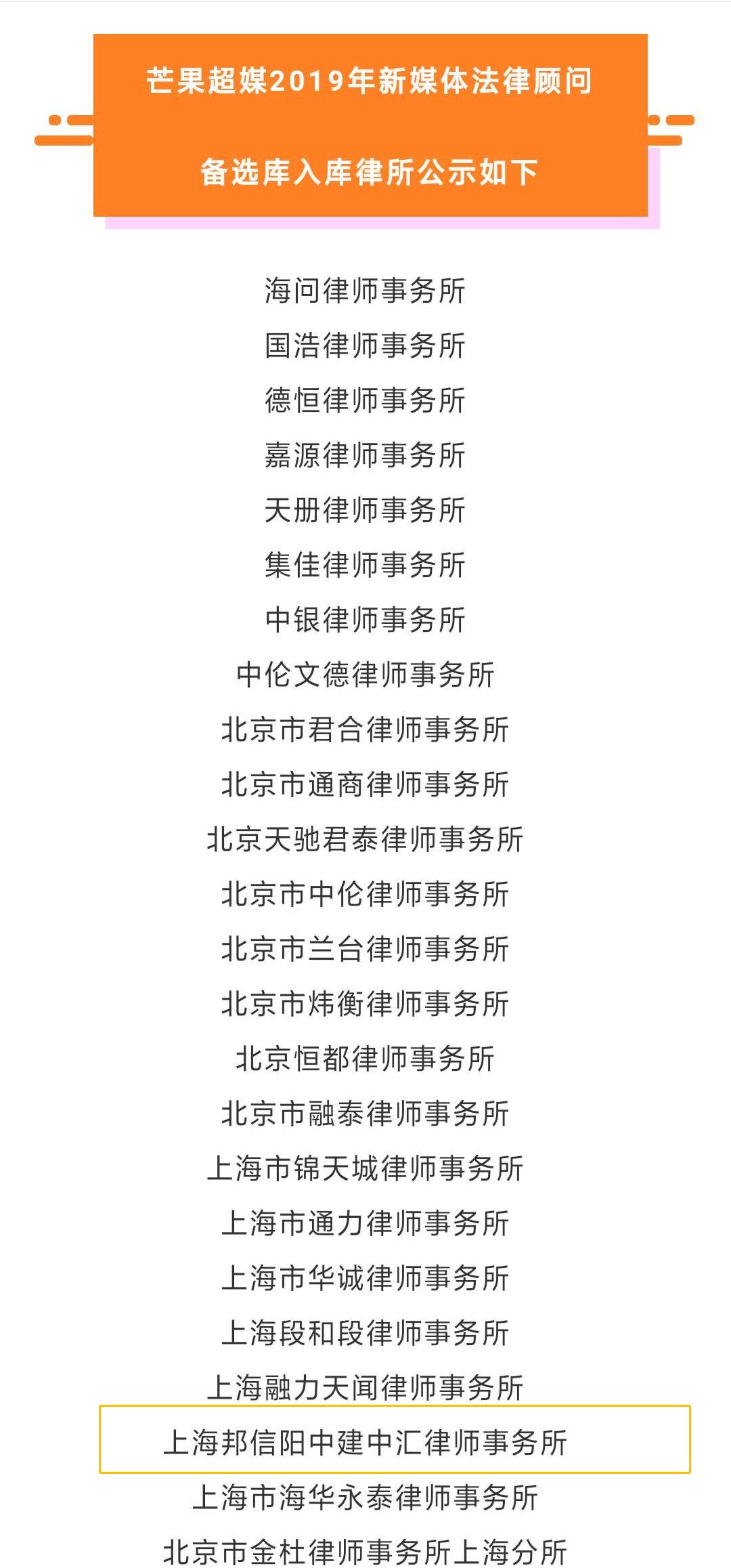 2019年3月18日,芒果超媒股份有限公司(以下简称“芒果超媒”)公布了2019年度新媒体法律顾问备选库的入库律所名单,上海邦信阳中建中汇律师事务所(以下简称“邦信阳中建中汇”)成功入选。