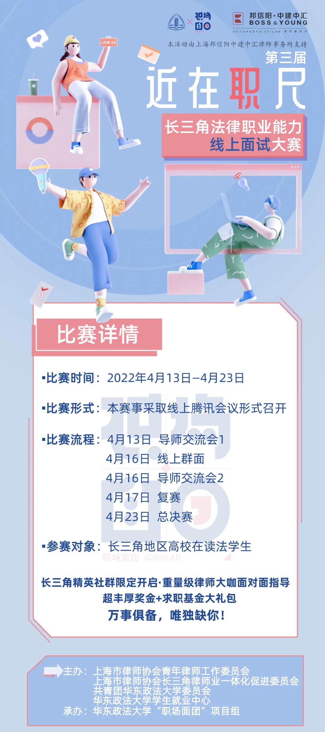 2022年3月25日,由上海邦信阳中建中汇律师事务所支持的第三届“近在‘职’尺”长三角法律职业能力线上面试大赛报名通道正式开启!