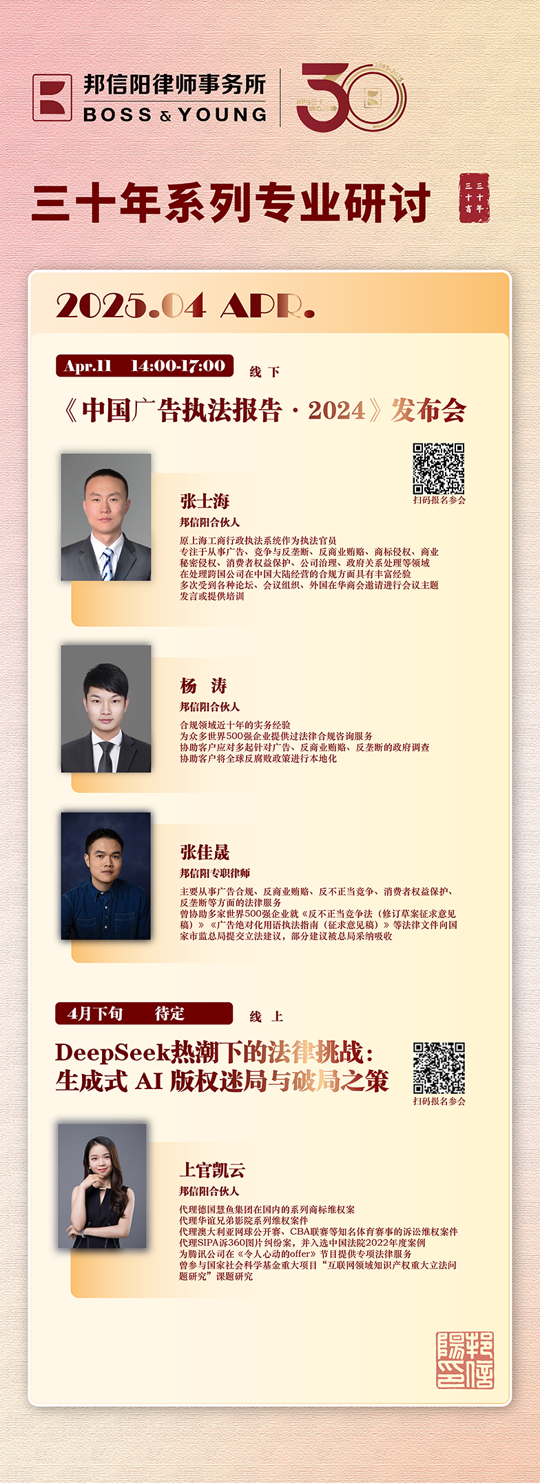 “三十年·三十言”系列活动是邦信阳在三十周年之际推出的专业品牌。系列活动聚焦各专业领域实务前沿,邀请相关领域专家,从学术与实务双重维度为从业者分享更多经验、提供更多解决思路。