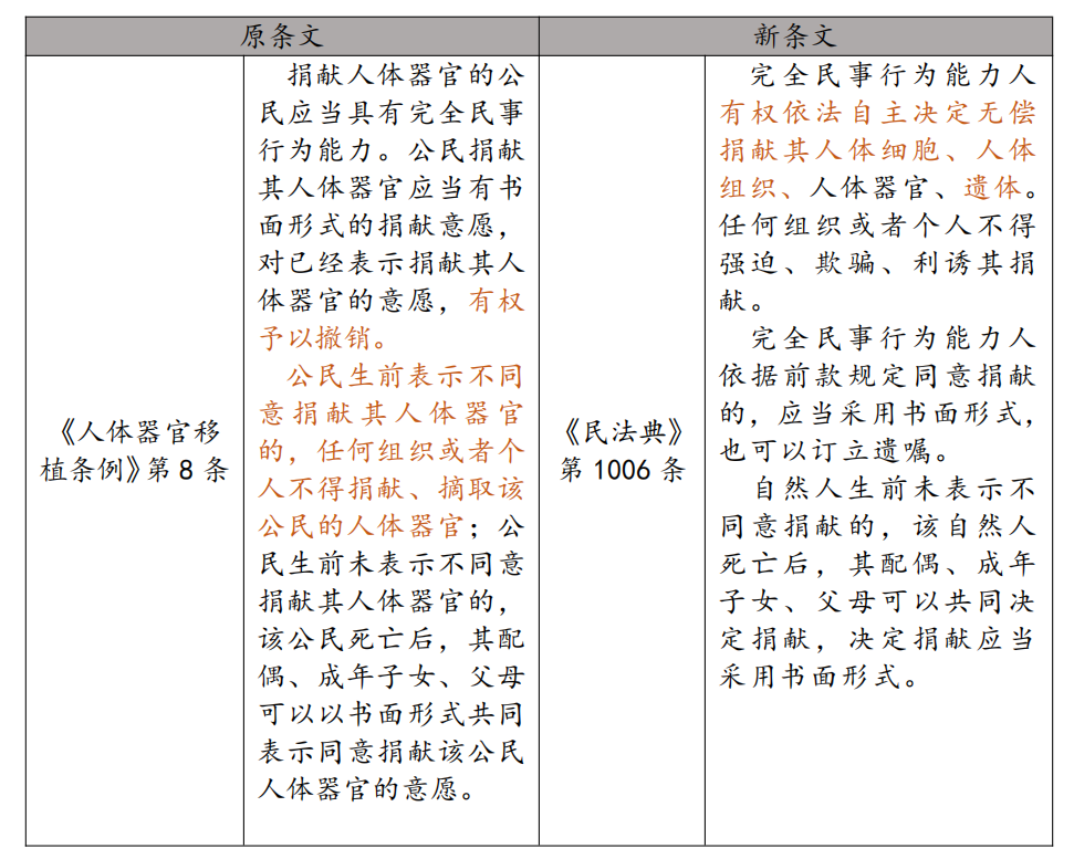 《民法典》第1006条扩大了完全民事行为能力人有权依法自主决定无偿捐献人体的范围。在此之前,只有国务院2007年颁布的《人体器官移植条例》明确规定公民有权捐献人体器官,而对于人体细胞、人体组织、遗体的捐献,立法上几乎是一片空白。尽管原卫生部曾于2001年颁布《人类精子库管理办法》,国务院曾于2019年颁布《人类遗传资源管理条例》,但是上述部门规章、行政法规仅是站在行政机关的角度对精子、卵子等人类遗传资源的采集、使用、管理作出规定,并非站在捐献者的角度明确捐献者的相关权利义务。随着社会的发展进步和人们思想观念的进一步开放,遗体捐献、捐精、捐卵等话题日益走进人们的视野,《民法典》首次明确完全民事行为能力人有权捐献的人体范围包括人体细胞、人体组织、遗体,可谓填补了我国人体捐献立法的一大空白,具有开创性。