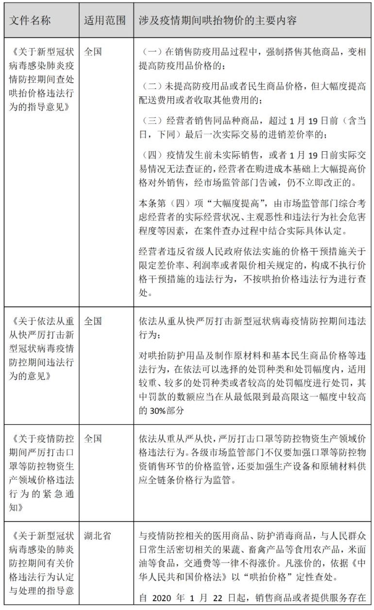 我们认为春节疫情期间商品价格上涨的原因主要可以分为三类,第一类是因春节期间经营企业的进价成本上涨导致商品售价的上调,例如春节假期生产企业支付3倍工资导致商品的生产成本大幅上升,进而上调商品出厂价格,零售端因此提高商品零售价格;第二类是供需不平衡导致的商品价格在市场调节下上涨,春节期间众多生产类企业放假停工供给不足,而疫情爆发公众因恐慌心理购入大量防疫和民生商品导致需求激增,整个市场供需不平衡,进而引发商品价格整体上涨;第三类是不良商家为了赚取高额利润,利用疫情期间物资紧张的情况,人为囤积居奇,大幅抬高商品价格。虽然按照《价格法》第六条的规定,商品价格和服务价格,除适用政府指导价或者政府定价外,实行市场调节价,由经营者自主制定,因此通常情况下执法部门仅对第三类行为进行查处,但在目前的特殊情况下,第二类行为也有被执法部门查处的可能性,在市监总局及各省已经出台相关哄抬物价认定意见的情况下,疫情期间经营者需要严格遵循各省各部门制定的文件,不能仅以市场供需作为定价的基准,一旦超出规定的购销差价率进行定价的或在短时间内大幅提高商品价格的,可能被认定为“哄抬物价”。