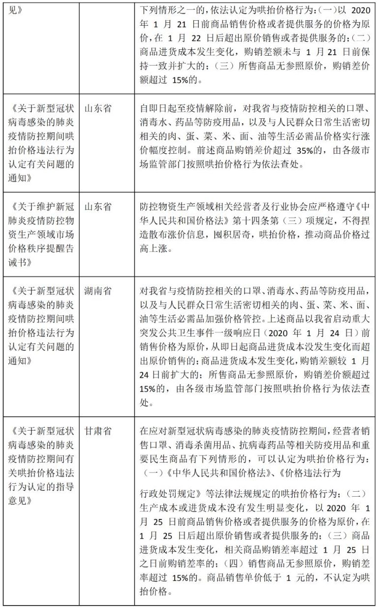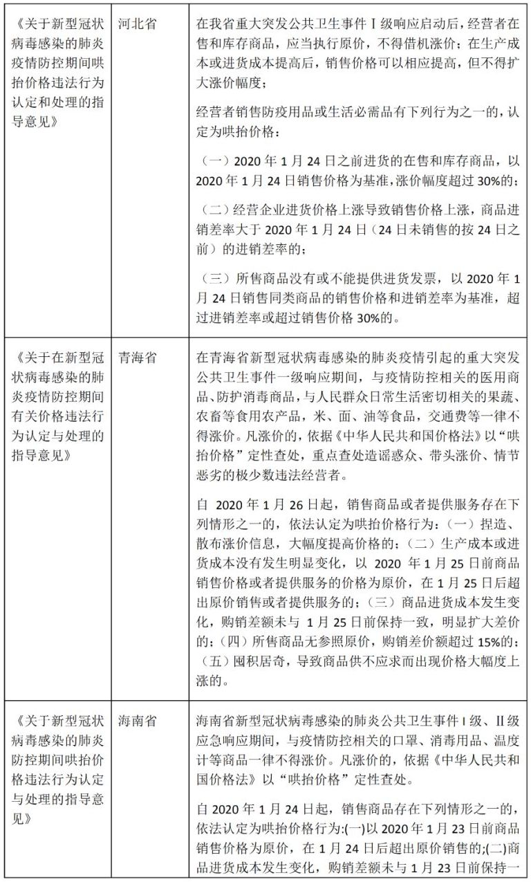 1月25日起,十几个省份发布了其辖区内疫情期间哄抬物价认定意见,2月1日,市监总局发布《指导意见》,在国家层面就疫情期间“哄抬物价”的表现形式及认定标准提供了细则。《指导意见》第十条规定“各省、自治区、直辖市市场监管部门可根据本意见,报经省级人民政府同意,出台认定哄抬价格违法行为的具体标准以及依法简化相关执法程序的细化措施,并向市场监管总局(价监竞争局)备案。在本意见出台前,省级市场监管部门或者其他有关部门经省级人民政府同意,已经就认定哄抬价格违法行为作出具体规定的,继续执行”,因此,虽然市监总局已经出台了国家层面的《指导意见》,但各省出台的哄抬物价认定意见仍在其适用的地域范围内具有效力,目前《指导意见》以及各省出台的哄抬物价均属有效文件,应该一并予以遵守。需要注意的是,各省因各地实际情况不同,对于涨价主要有两种意见,第一种意见是明确防疫和民生商品一律不得涨价,采取这种意见的省份包括湖北、海南、青海等,第二种意见是控制涨价幅度,允许在一定范围内的涨价,例如浙江省要求涨价幅度控制在20%以内并禁止高于同类商品价格20%以上。在理解哄抬物价认定文件时,应该首先关注认定意见中对于调整价格的定性问题,如明确不允许涨价的,应该维持原价,如允许涨价的,才能在限定幅度内调整价格。