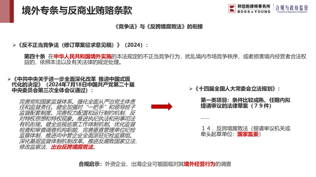 本次发布会分为三个分享主题,主题一介绍了《竞争法草案》的出台程序及《竞争法草案》中的反商业贿赂条款的修订情况及体现出来的执法趋势以及企业需要注意的合规要点;主题二聚焦于《竞争法草案》中与宣传推广行为有关的主要修订以及合规主要以及《竞争法草案》对平台和大型企业提出来的合规新要求;主题三针对《竞争法草案》有关调查程序和处罚条款作出的修订和增补,同时关注《竞争法草案》中首次加入的涉及境外竞争行为的条款。