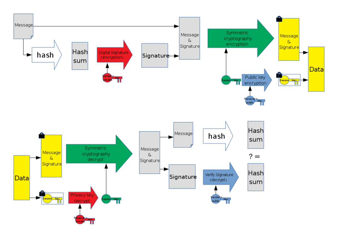 这张图可以算是一份电子文件的数字签名与传输过程的简化版,下面简要描述一下: