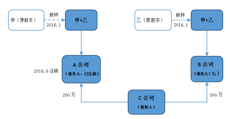 自然人甲设立A公司,自然人乙设立B公司。C公司和A公司、B公司分别签署了购销合同,约定由C公司分别向A公司和B公司供货,2014-2015年期间,A公司欠款200万,B公司欠款300万。2016年1月,A公司的股东变为甲、乙, B公司的股东也变为甲、乙,即A公司、B公司均从一人公司变更为多人公司。2016年6月,C公司向A公司、B公司发函催告,B公司回函对欠款提出异议并要求协商。C公司之后准备起诉时才发现A公司在2016年6月已注销。