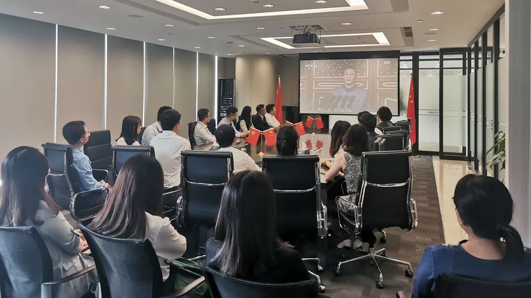 上午8时,在金外滩国际广场15楼会议室内,律所全体党委委员、支部书记、支部委员及党员代表共计70余人集中收看了直播,伴随着庄严肃穆的国歌声,现场人员全体起立,向着大屏幕里升起的五星红旗行注目礼。除了在会议室里集中收看,公事在外的党员们还通过电视、电脑、手机等方式观看直播,共同见证建党百年这一辉煌时刻。
