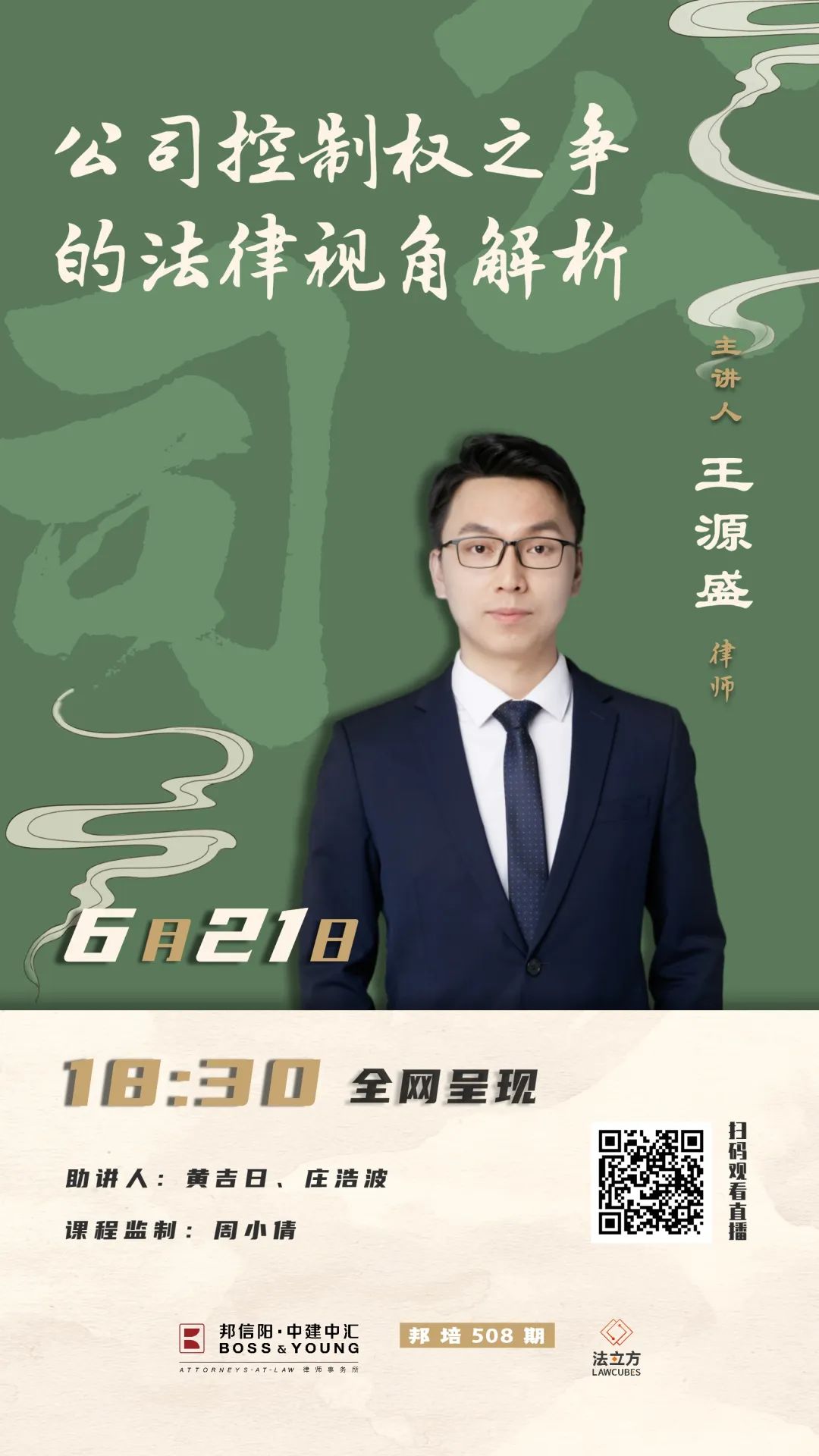 6月21日(周二)18:30,上海邦信阳中建中汇律师事务所合伙人王源盛律师主讲邦培第508期——《公司控制权之争的法律视角解析》。