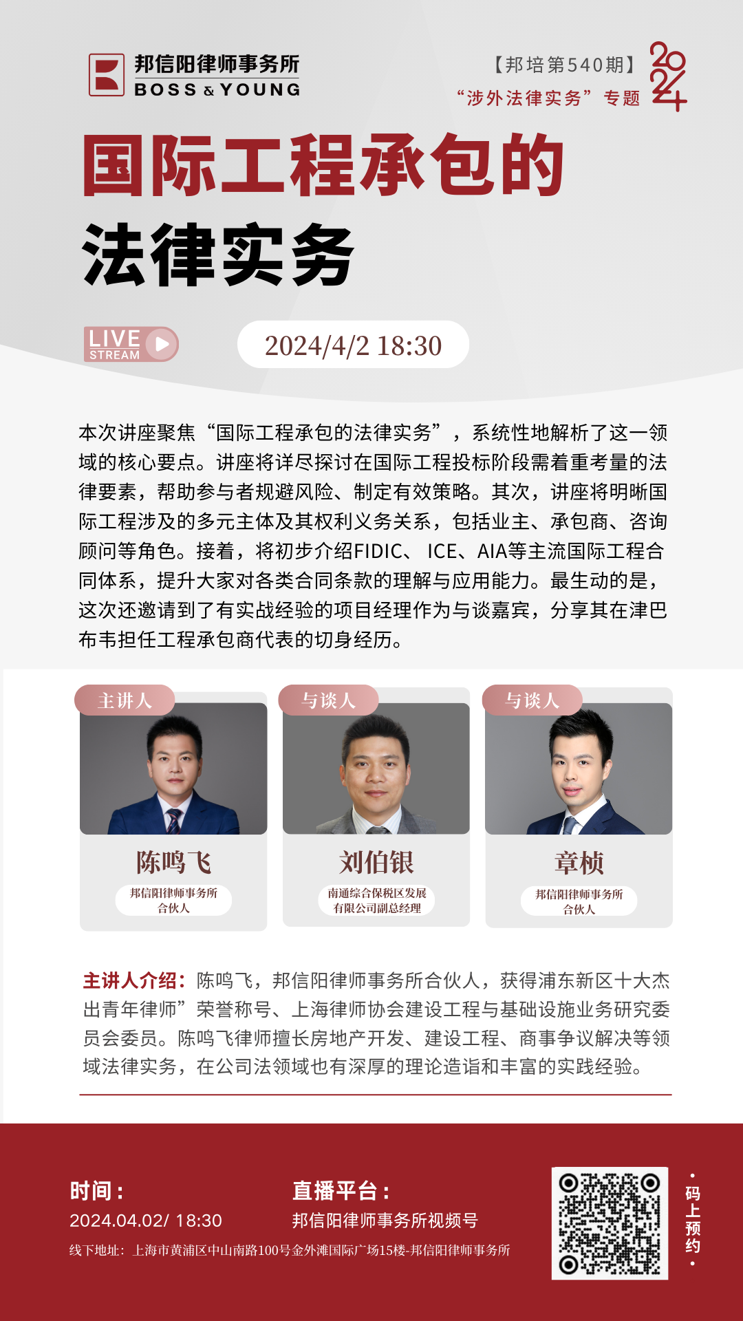 【邦培第540期:国际工程承包的法律实务】将于4月2日晚18:30在邦信阳律师事务所视频号直播。