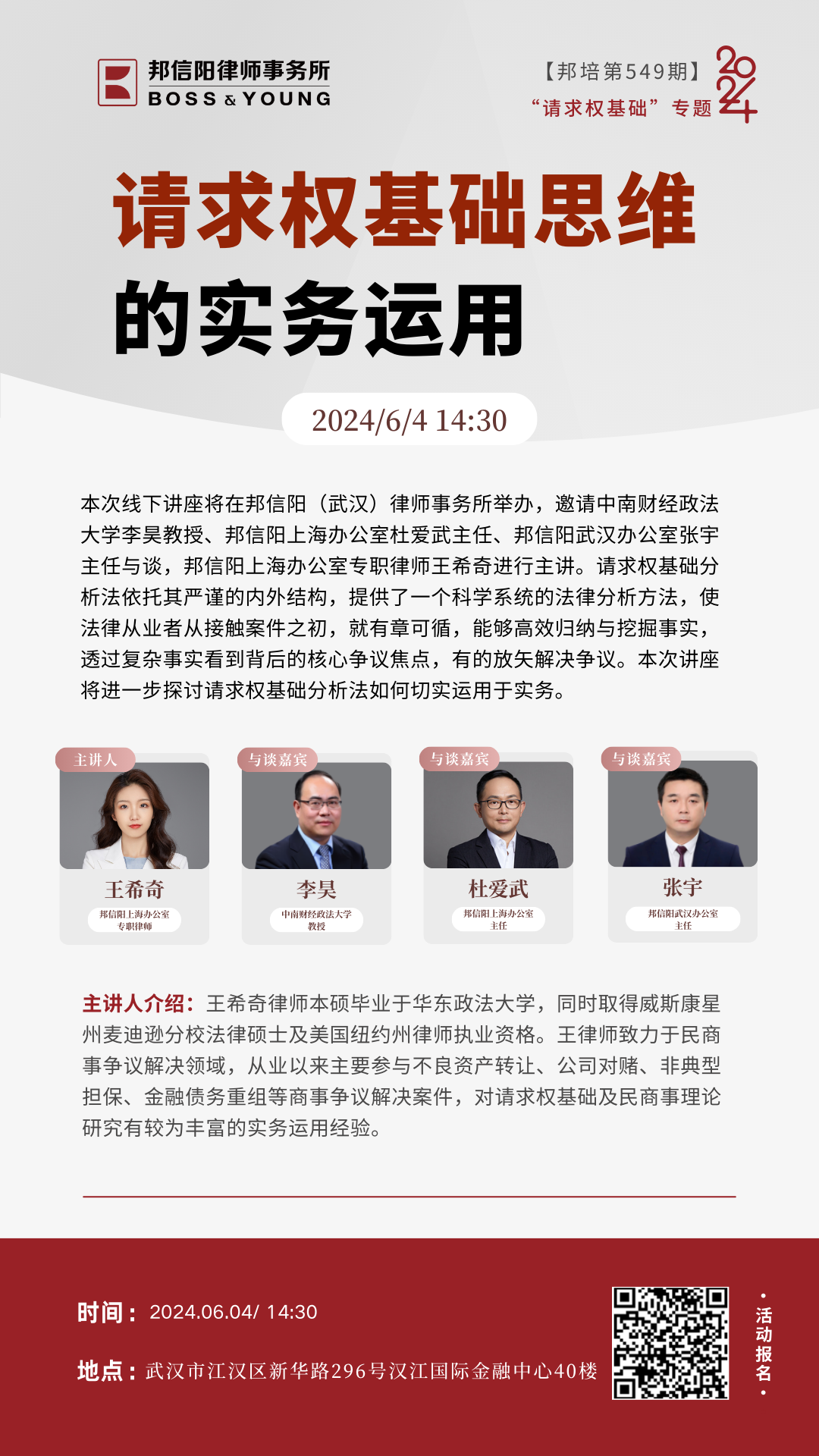 本次线下讲座将邀请中南财经政法大学李昊教授、邦信阳上海办公室杜爱武主任、邦信阳武汉办公室张宇主任与谈,邦信阳上海办公室王希奇律师主讲。本次讲座将进一步探讨请求权基础分析法如何切实运用于实务,欢迎大家踊跃报名参加。