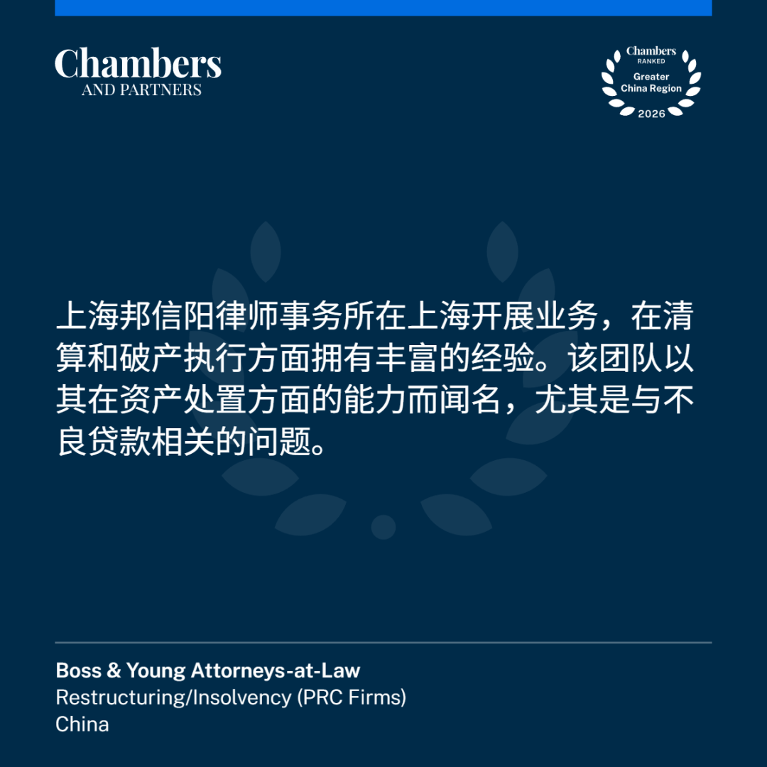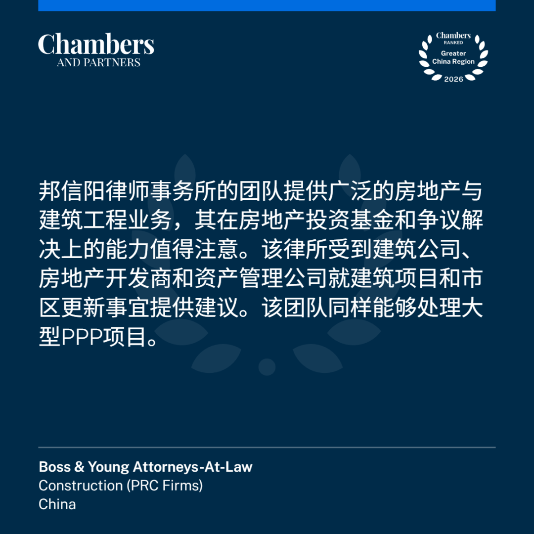 1月15日,国际权威法律评级机构钱伯斯(Chambers and Partners)公布《钱伯斯大中华区法律指南2026》(Chambers Greater China Region 2026)。上海邦信阳律师事务所(以下简称“邦信阳”)凭借着杰出的专业水平和优秀的客户口碑,上榜房地产、建设工程、公司调查/反腐败、破产重组四大领域。其中,建设工程领域自钱伯斯评级开始连续不间断上榜(16年)。