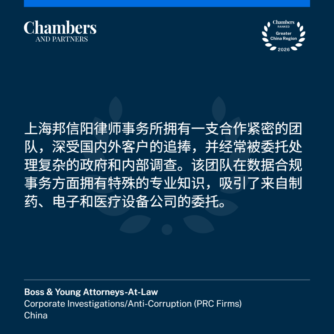 凭借卓越的表现,邦信阳的公司调查/反腐败领域连续获得2024年、2025年《钱伯斯全球法律指南》(Chambers Global Legal Guide)及《钱伯斯大中华区法律指南》(Chambers Greater China Region)重点推荐。邦信阳的律师入选2024 GRCD中国客户首选合规律师“反腐败反商业贿赂”榜单。