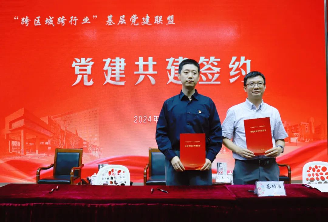 (图为:上海邦信阳第二支部书记戴天骁与上海市儿童医院综合医技支部书记胡慧勇签订党建共建协议)