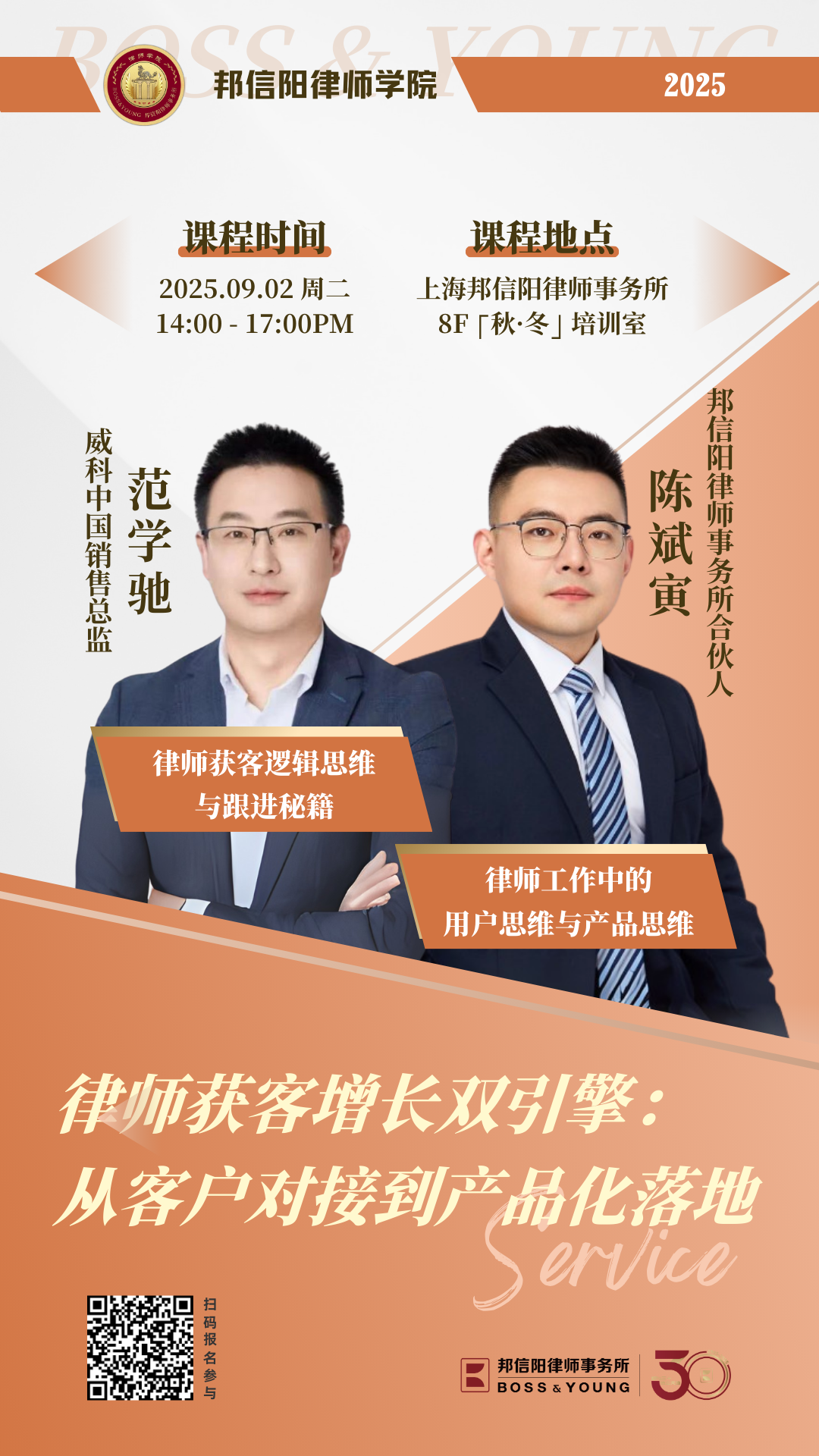 【律师获客增长双引擎:从客户对接到产品化落地】将于9月2日下午14:00在上海邦信阳律师事务所举行,欢迎报名线下参与。本期课程特邀威科中国销售总监范学驰先生,邦信阳律师事务所合伙人陈斌寅律师主讲。