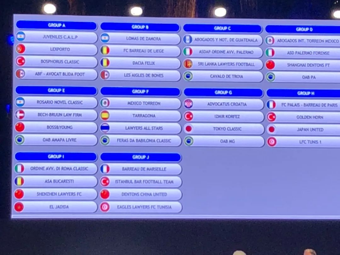 当晚9点,激动人心的抽签仪式在Cambrils Park度假村举行。组委会详细介绍了本次赛事的概况,本次比赛有来自37个国家146支球队共计3221名律师参加,规模达到历史之最。本所足球队参加的Classic组别共有40支球队,根据本次赛事的安排,所有球队被分为10个小组,每组第一名和6个成绩最好的第二名将进入前16强的淘汰赛,剩余球队将进行17-40名的排位赛。