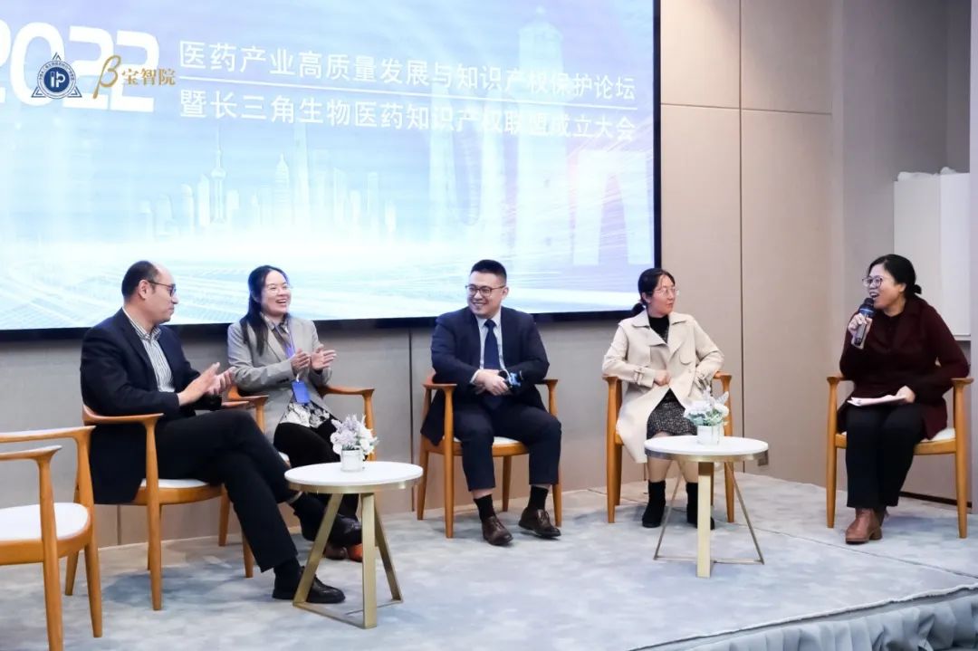 圆桌讨论环节由同济大学蒋莉教授主持。恒锐知产负责人黄海霞、上药康希诺副总经理刘明、扬子江药业窦夏睿、同济大学教授曹丽荣、长三角生物医药知识产权联盟秘书长陈斌寅围绕“医药产业高质量发展与知识产权保护”“发挥举国体制在科技创新中的作用” “新制度对科技创新的推动作用”等话题进行了深入的观点交流及探讨。