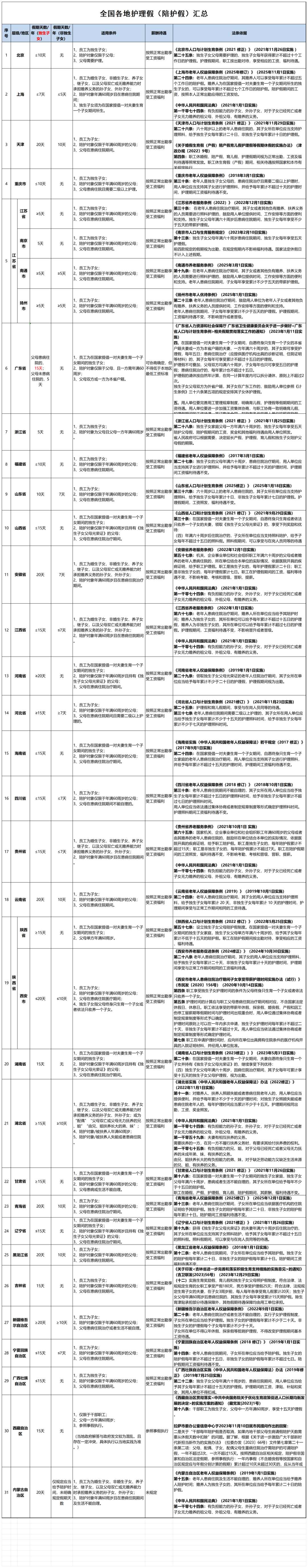 独生子女优势显著:天津、安徽、云南、黑龙江、内蒙古等地给予20天护理假,为全国最高;河南、新疆等地也明确不少于20天。