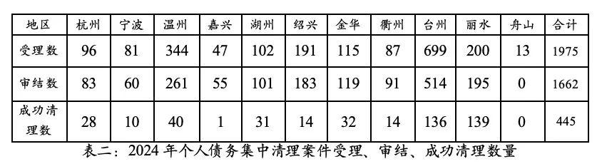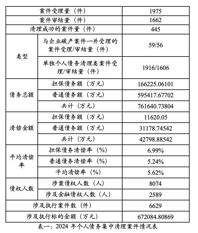 2024年全年,全省法院共受理个债清理案件1975件,审结1662件。其中,与企业破产案件一并受理的个债清理案件共59件,审结56件。在1662件已审结的个债清理案件中,共完成清理445件,成功清理率约26.77%,与往年基本持平。